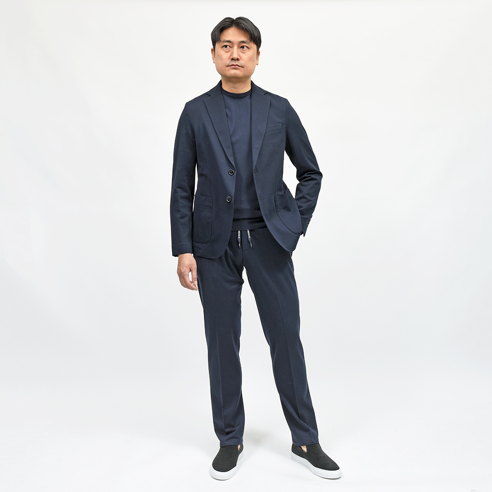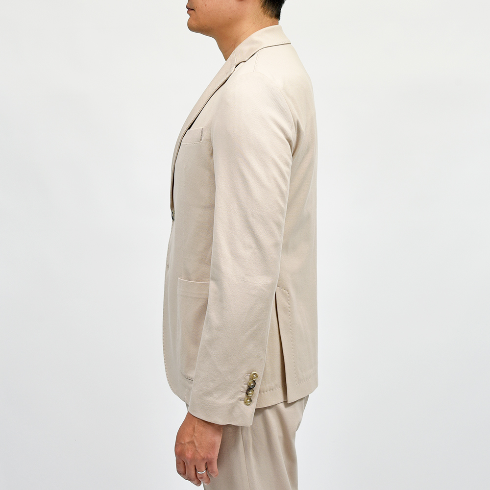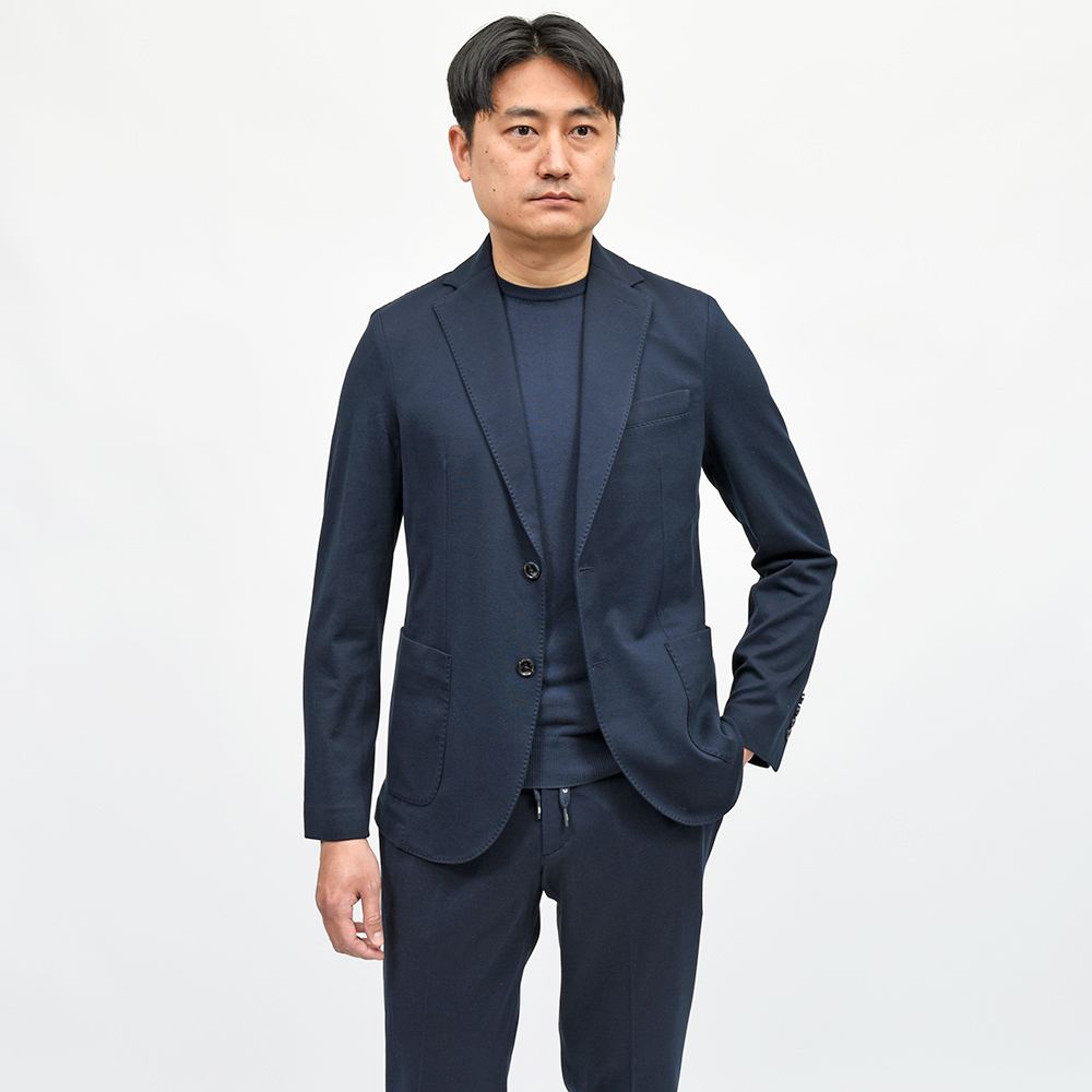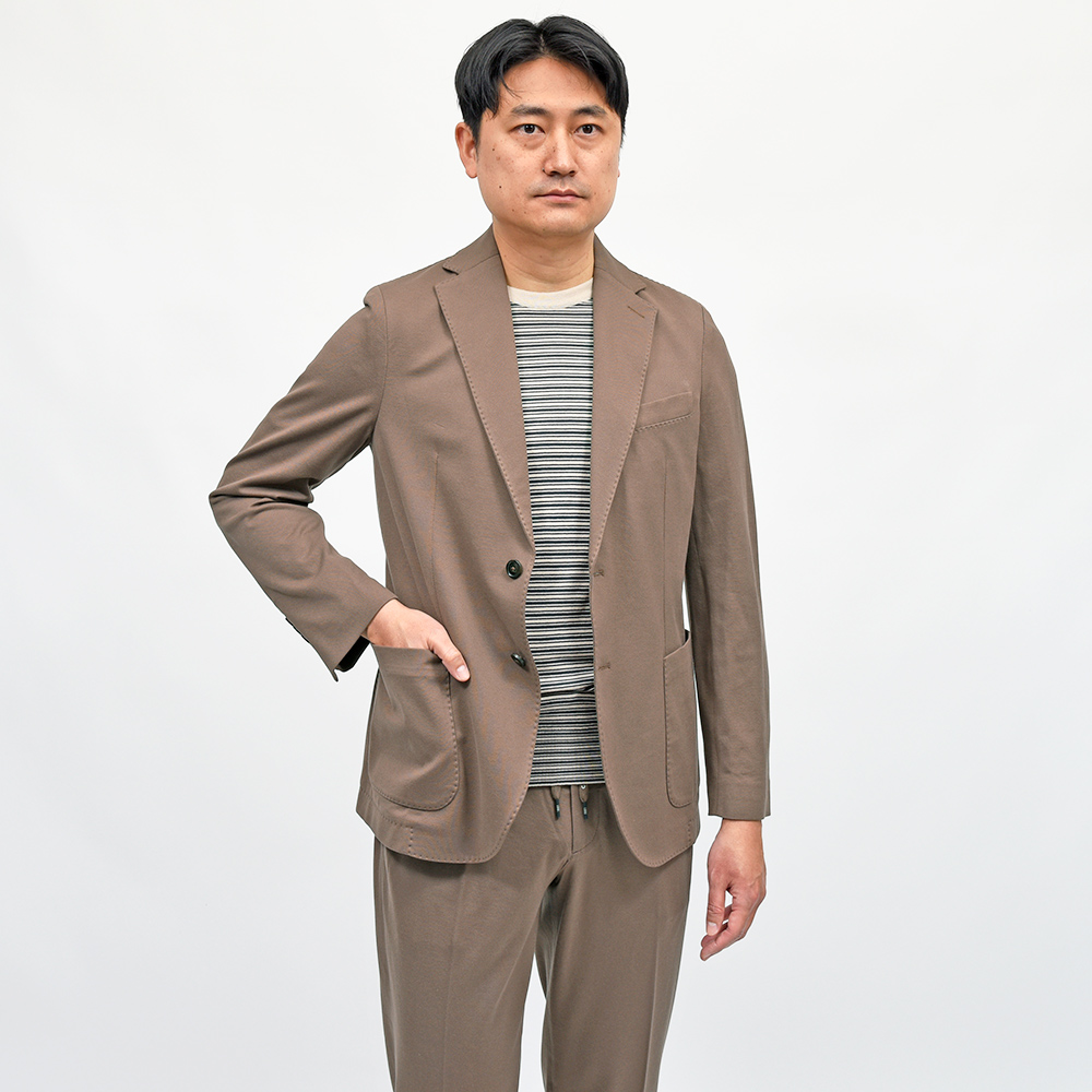 程よくタイトなシルエットに、フロントの2つボタン仕様がカジュアルなジャケッパンスタイルや、セットアップとして非常に有能な働きをしてくれる定番のモデルになります。