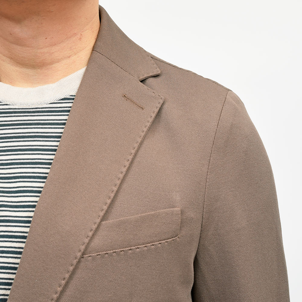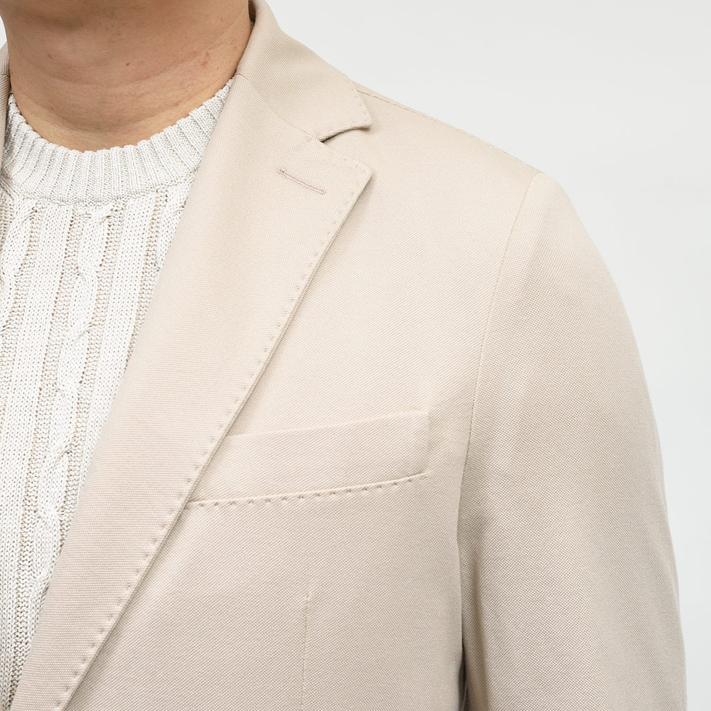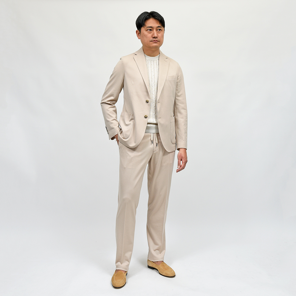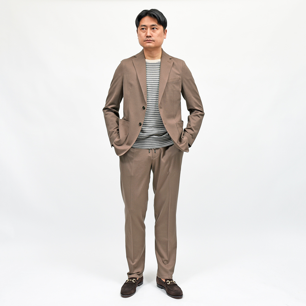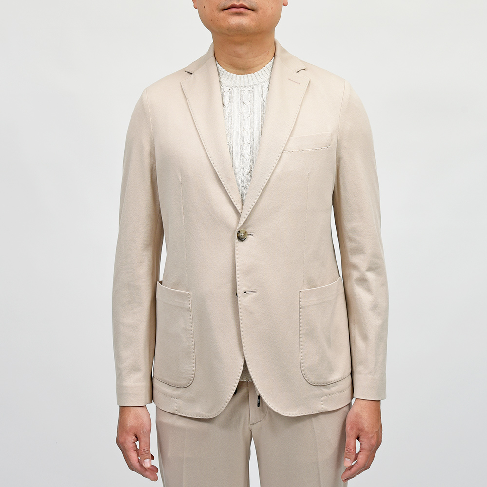 程よくタイトなシルエットに、フロントの2つボタン仕様がカジュアルなジャケッパンスタイルや、セットアップとして非常に有能な働きをしてくれる定番のモデルになります。