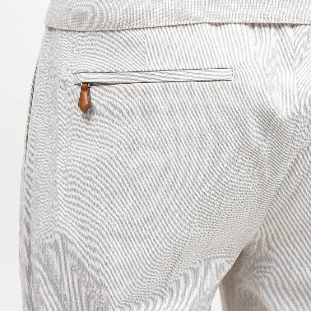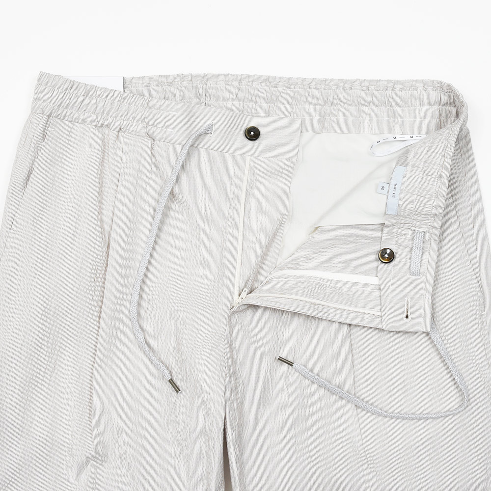 目付け220gのライトウエイトなコットンストレッチ素材は、清涼感あるシアサッカー生地。カジュアルな印象の強いシアサッカーストライプですが、やや細いピッチのストライプがモダンな雰囲気を漂わせます。また、大人のためのリラックスパンツを謳う“SOFT FIT”ですので、リラックスした雰囲気を高めてくれるストレッチ素材は好相性。程よく艶のある上品な質感ですので、ラフなジャケットと合わせてもすんなりと馴染んでくれます。