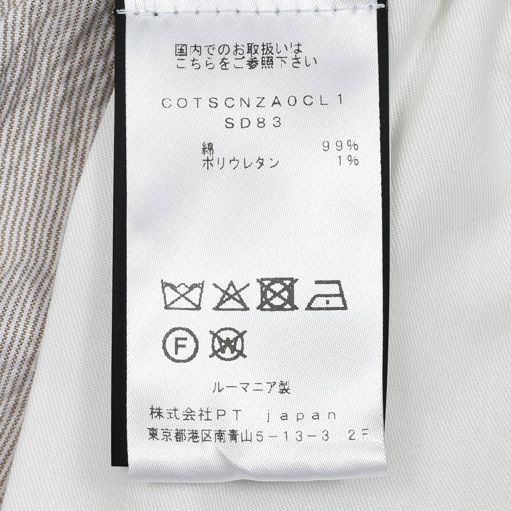 サイズ50で全体的に程よくゆとりのあるシルエットです。定番的なPT TORINOよりも股上が深いので腰回りのフィッティングに安心感があります。ワタリと太腿周りには余裕があり、膝下からはテーパードによってスッキリとした印象。もう少し細身で穿くのであればサイズ48でも問題ありません!