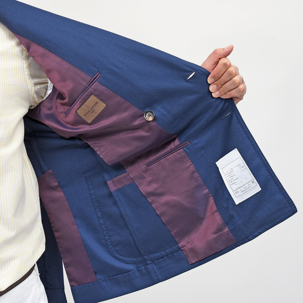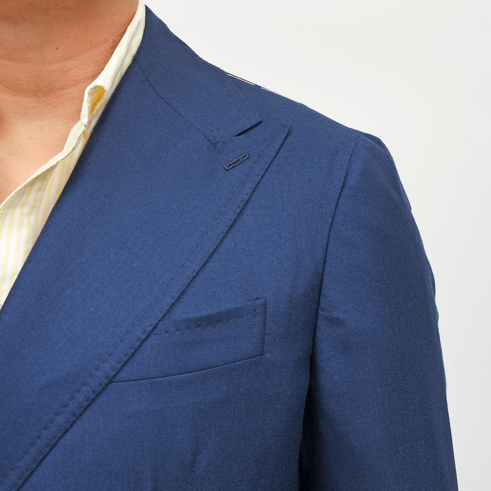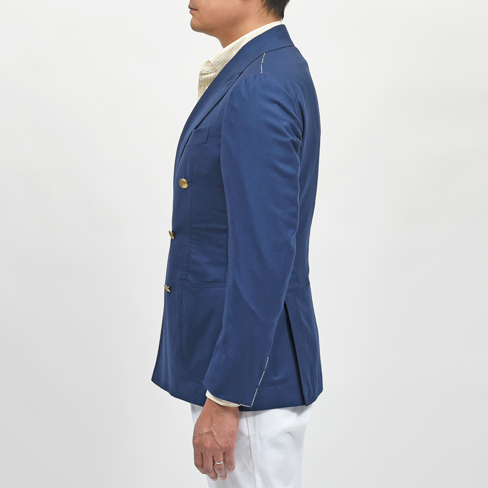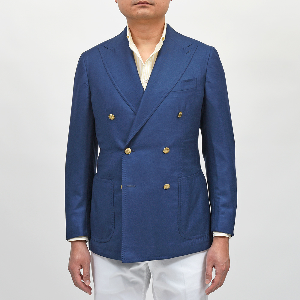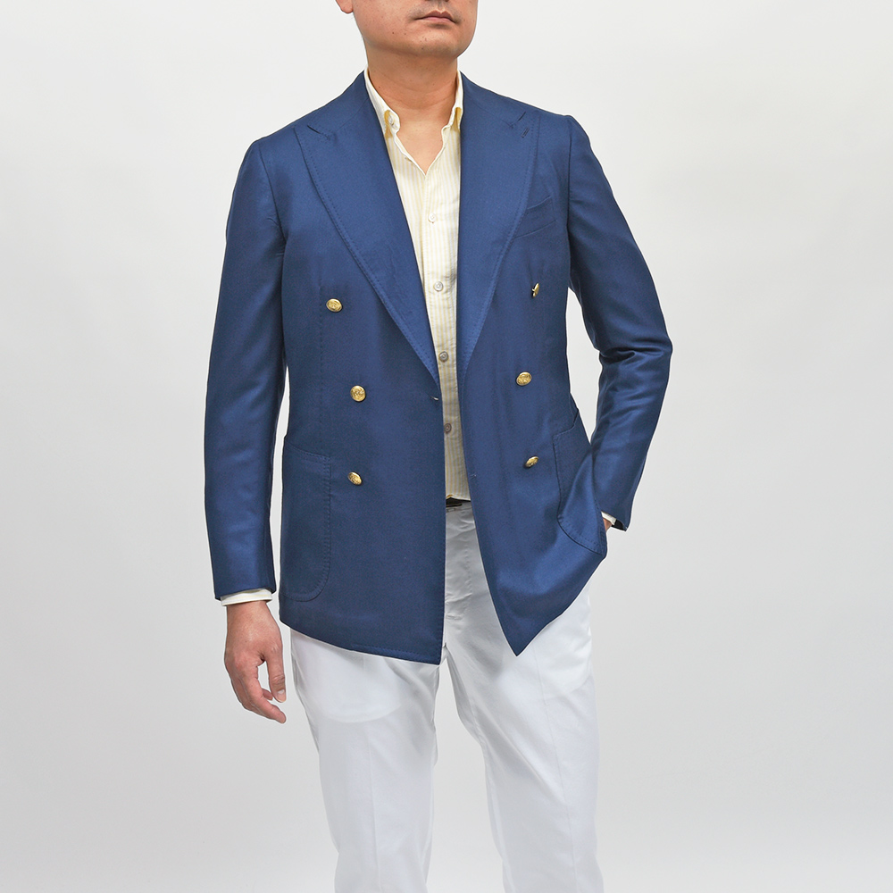 目付け180gのカシミヤ素材を使用したダブルジャケット。非常に軽やかなウエイトで仄かな起毛感があるため通年で着用いただけます。また、ボタンはゴールドのメタルボタンでブレザーの仕上がりとなっていますが、ホーンボタンが付属で付いているため、その時々の気分やシーズンによって付け変えることが可能です。長い期間愛せるパートナーのような存在になる一着と言えます。
