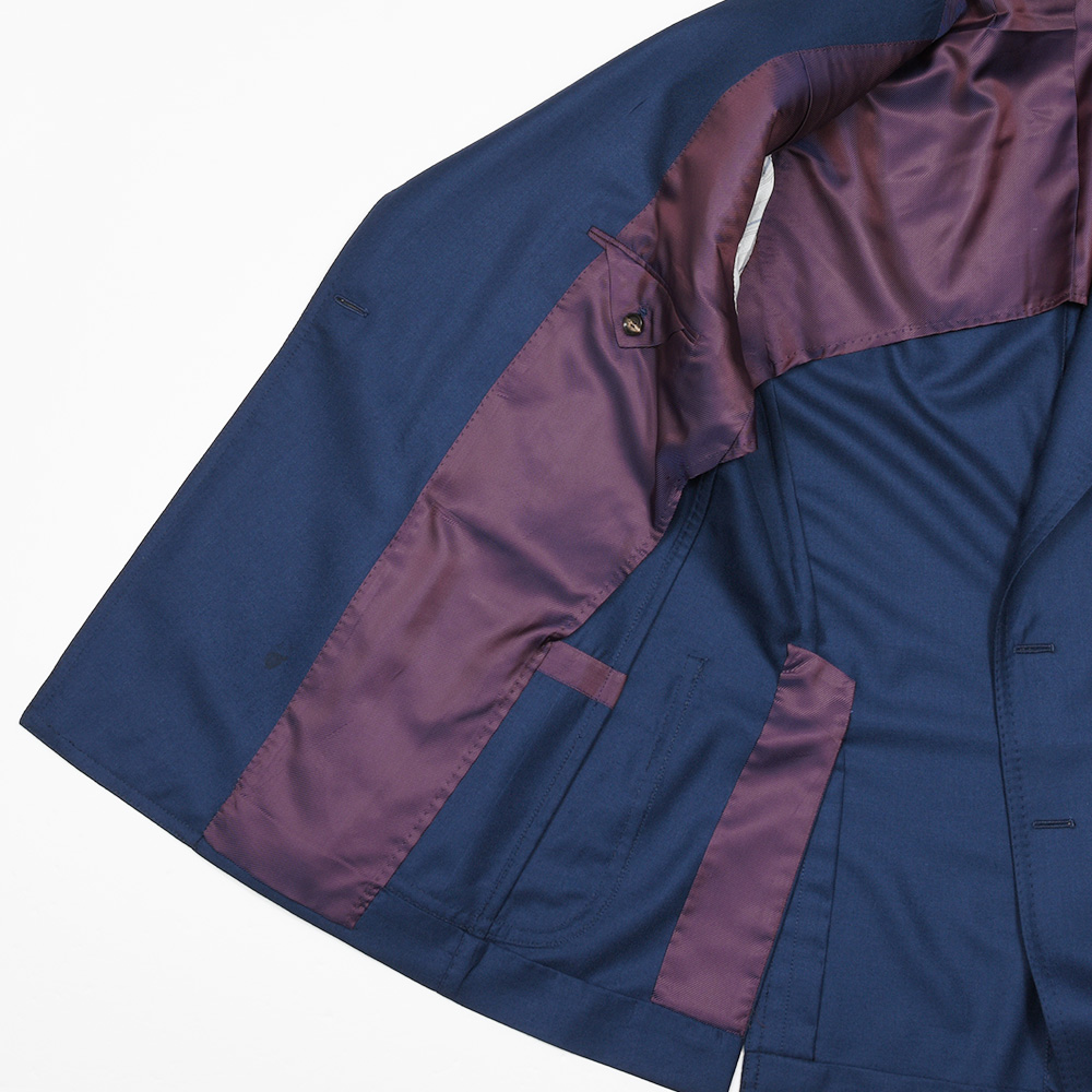 2パッチポケット、サイドベンツ、ラペル巾11.5cm、袖アンフィニッシュド(本切羽・開き見せなどの釦付け修理が必要)です。