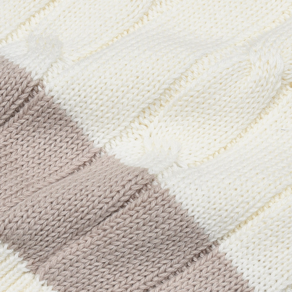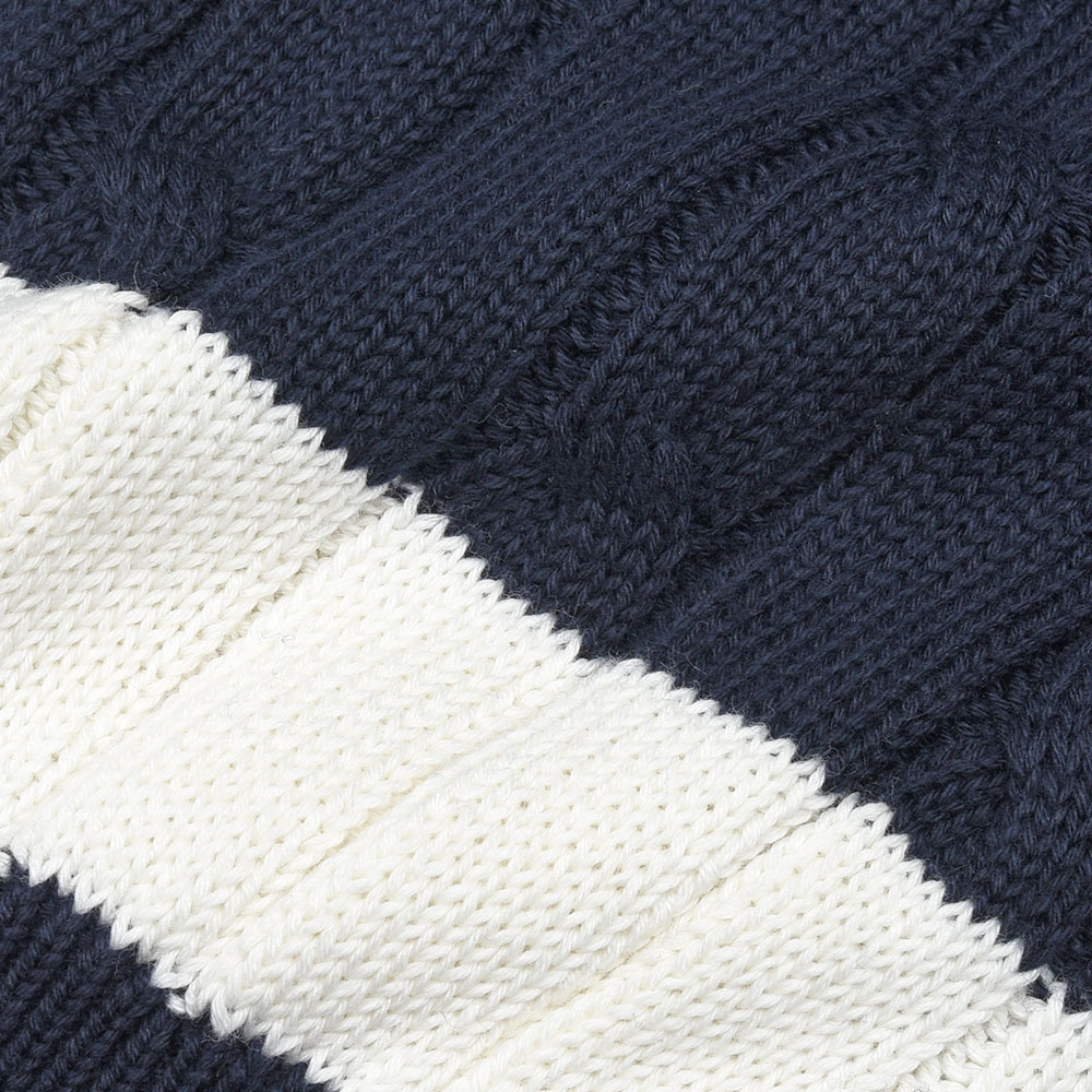 上質なコットン素材を使用した、非常に滑らかで柔らかなタッチのチルデンニット。タイトではないナチュラルなサイズ感のシルエットは、ケーブル編みの上品な雰囲気と合わさりモダンな佇まい。ラインはナチュラルなカラーを採用することで悪目立ちせず、スタイリングにそっと華を添えてくれる印象になります。
