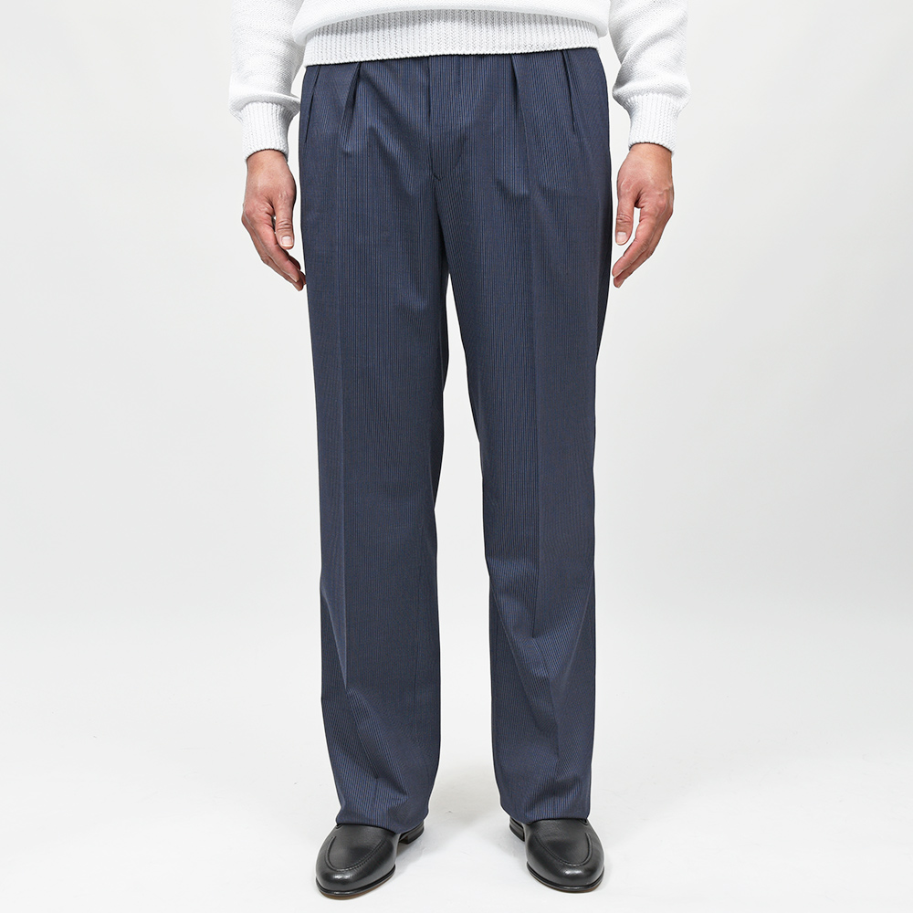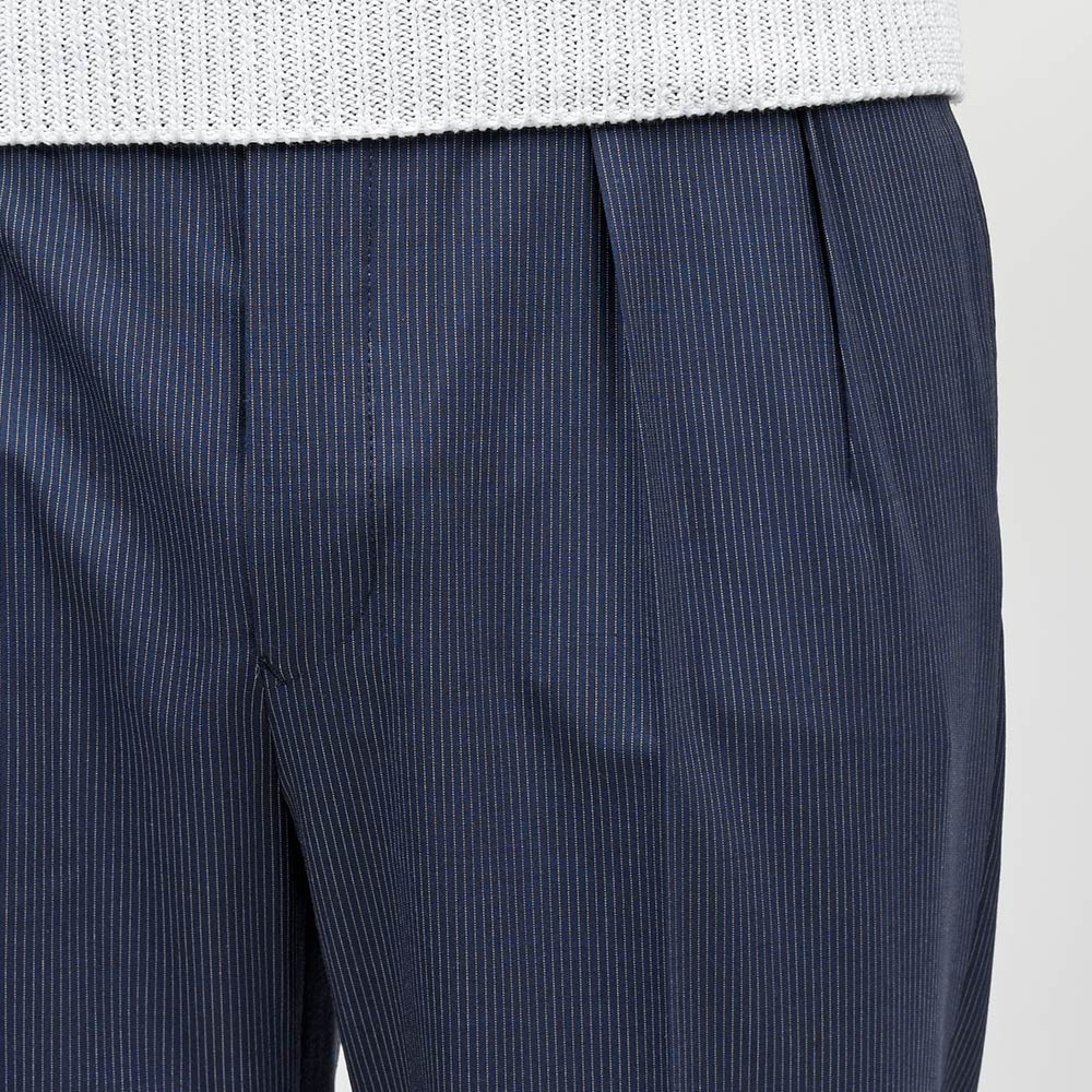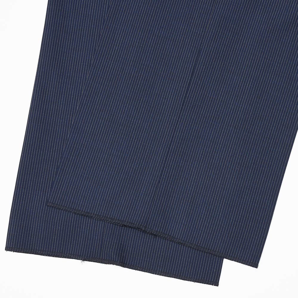 ネイビーベースにホワイトのピンストライプは、ファッション性の高いワイドシルエットと抜群の相性です。