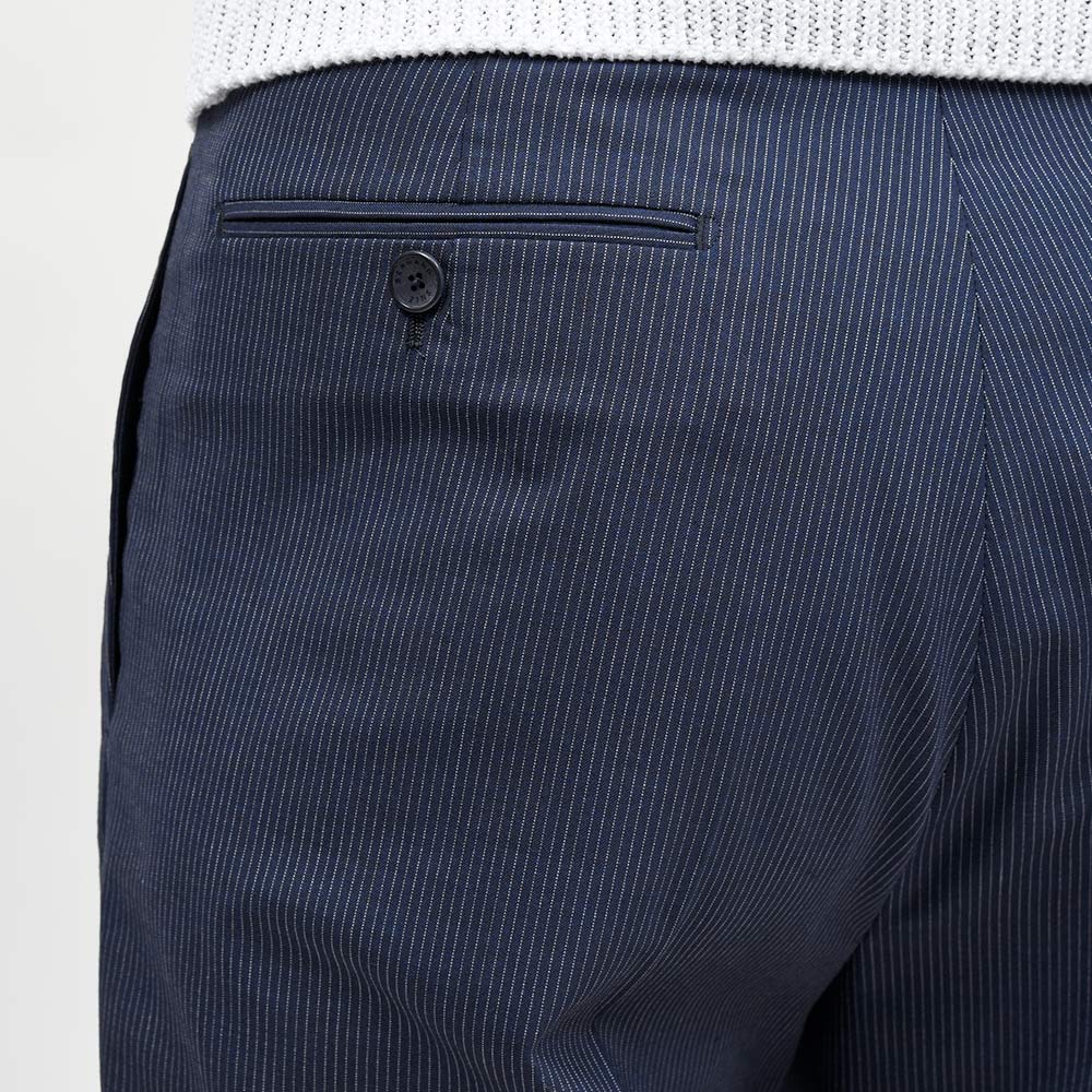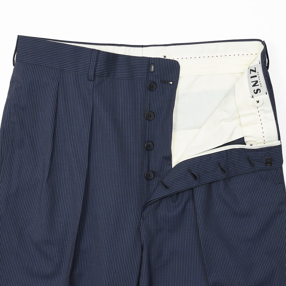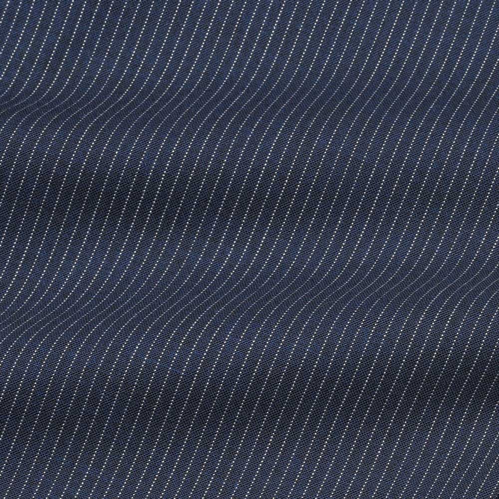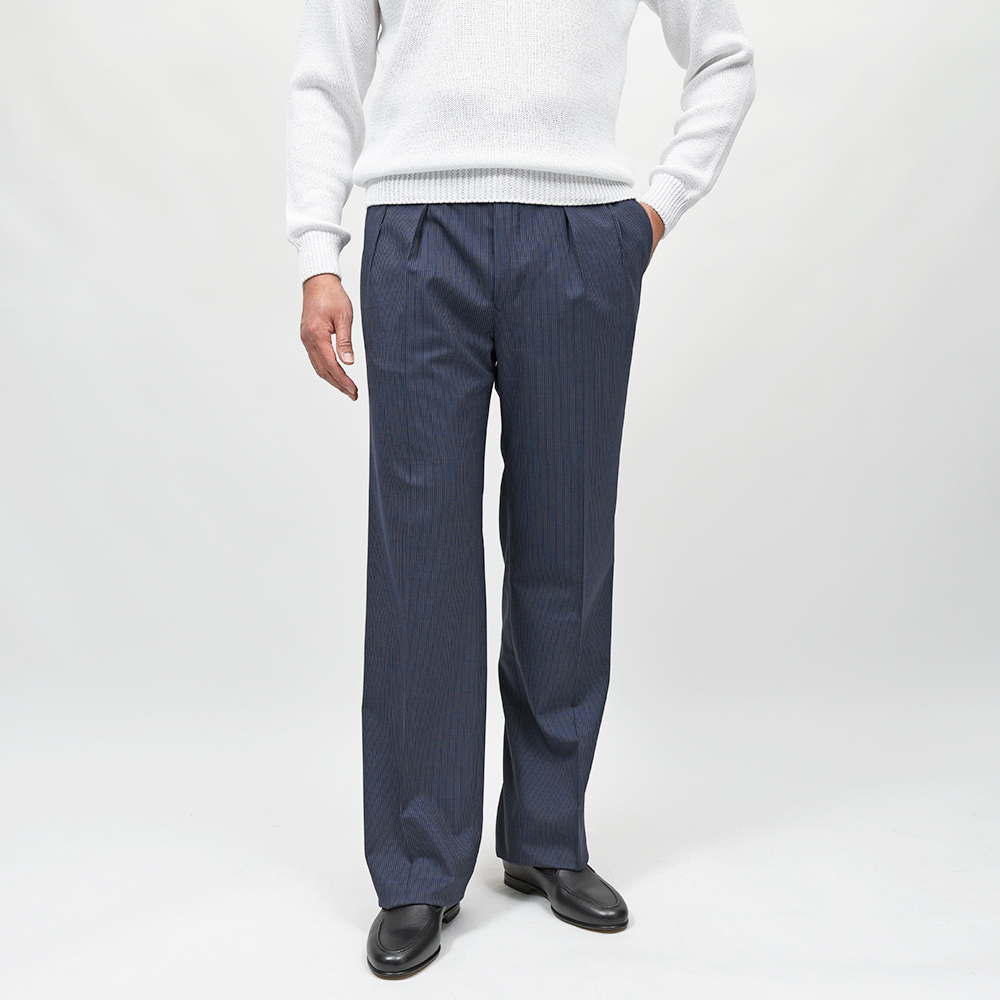 ネイビーベースにホワイトのピンストライプは、ファッション性の高いワイドシルエットと抜群の相性です。