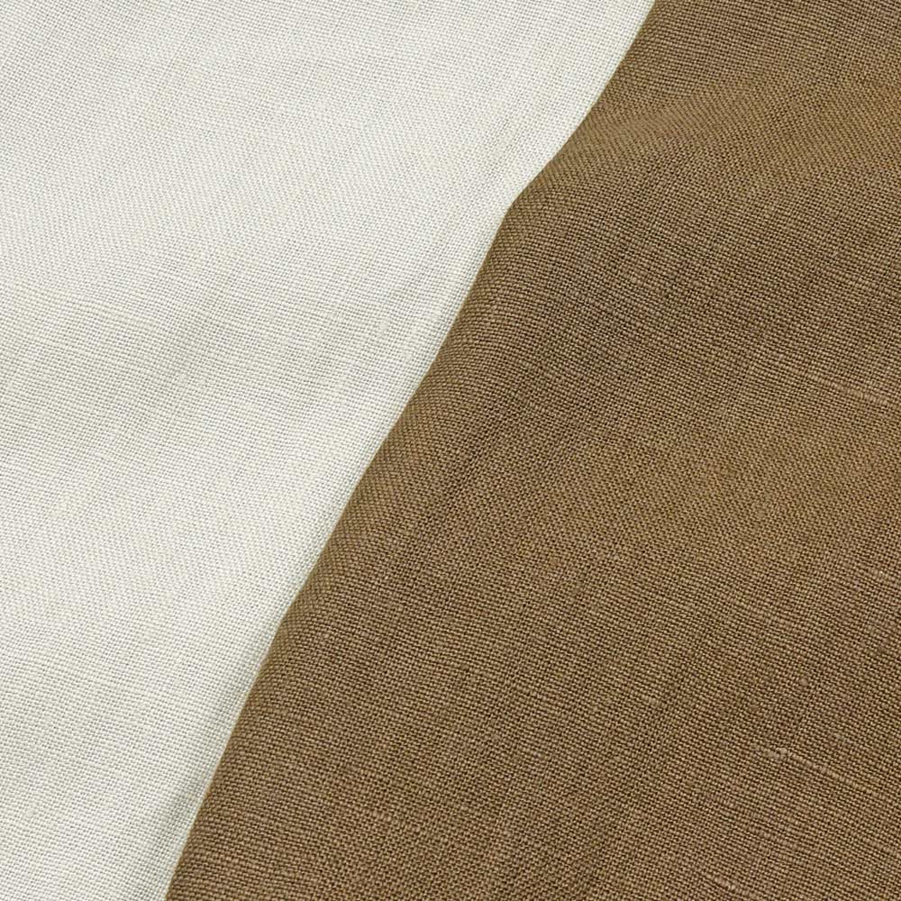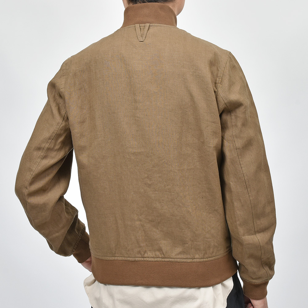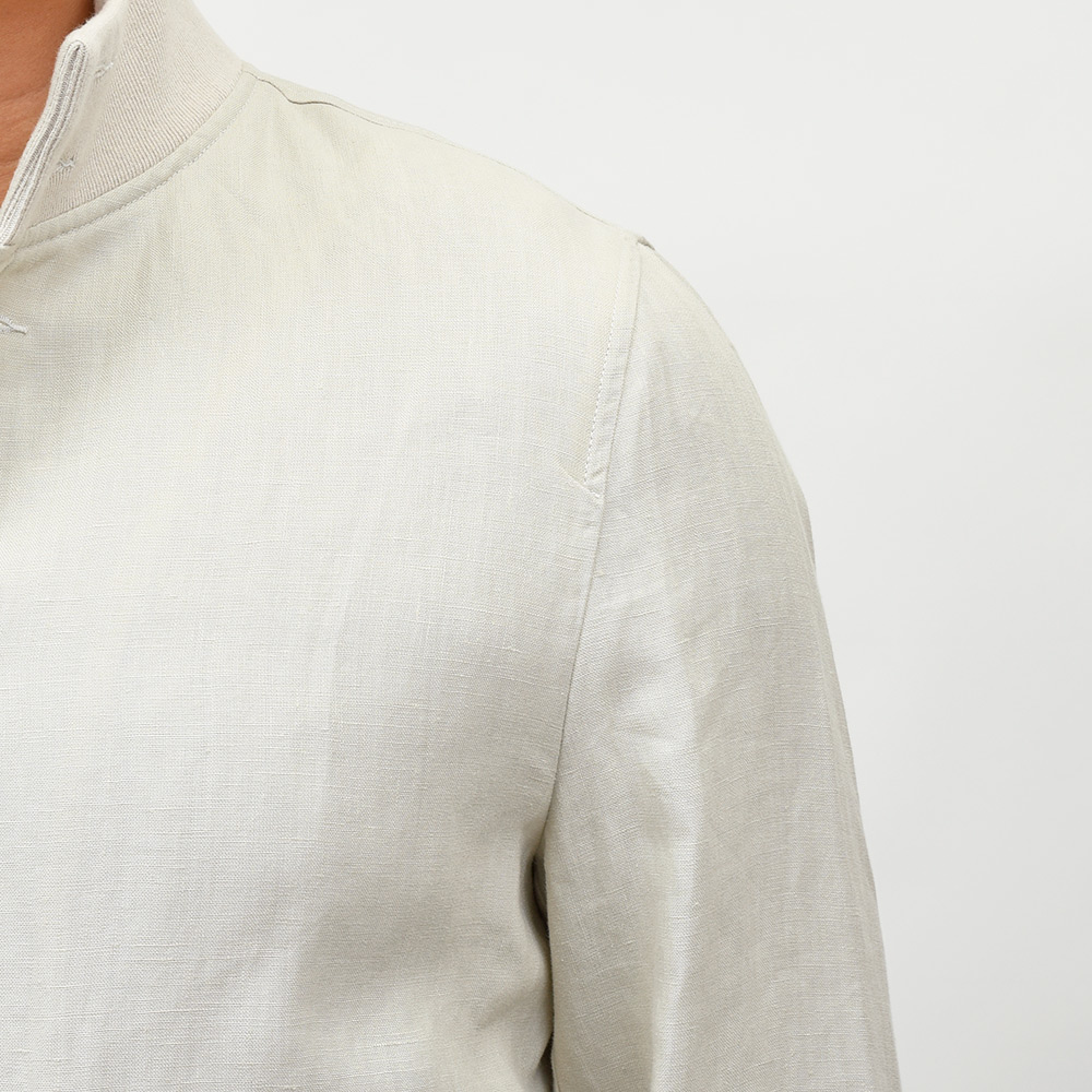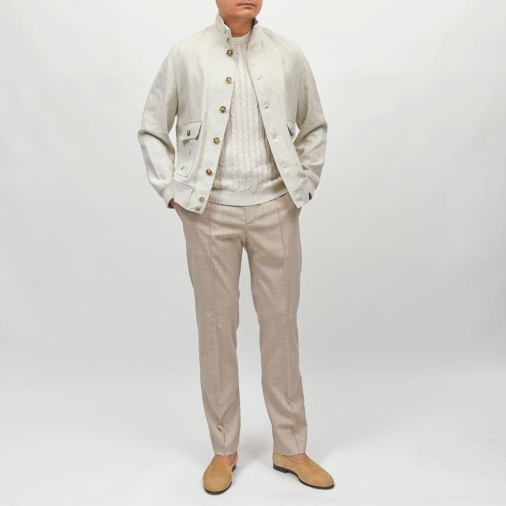 こちらは、程よいコシはありつつも薄手で柔らかなタッチに、控えめな光沢感のリネン素材を使用。清涼感あるリネン素材に、裏地を省いた軽量な仕立てなので非常に快適な着用感をもたらせてくれます。リネン素材特有の清涼感ある着心地ですので春先は勿論、暑い時期にカットソー一枚では寂しいという時にも助けになってくれる一品です。