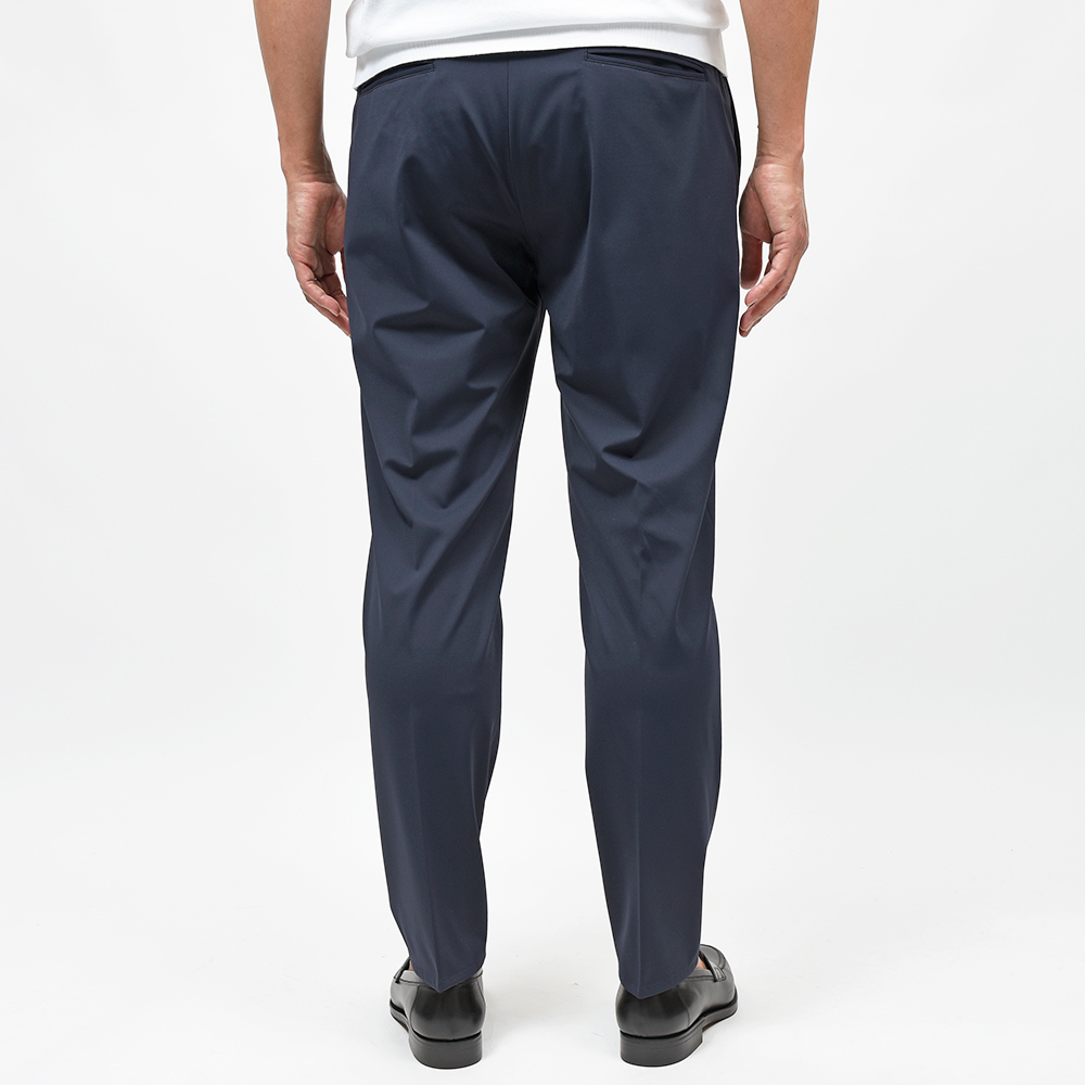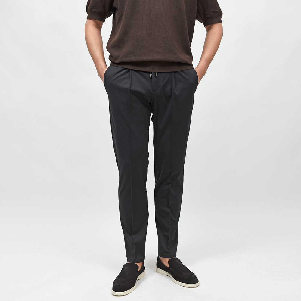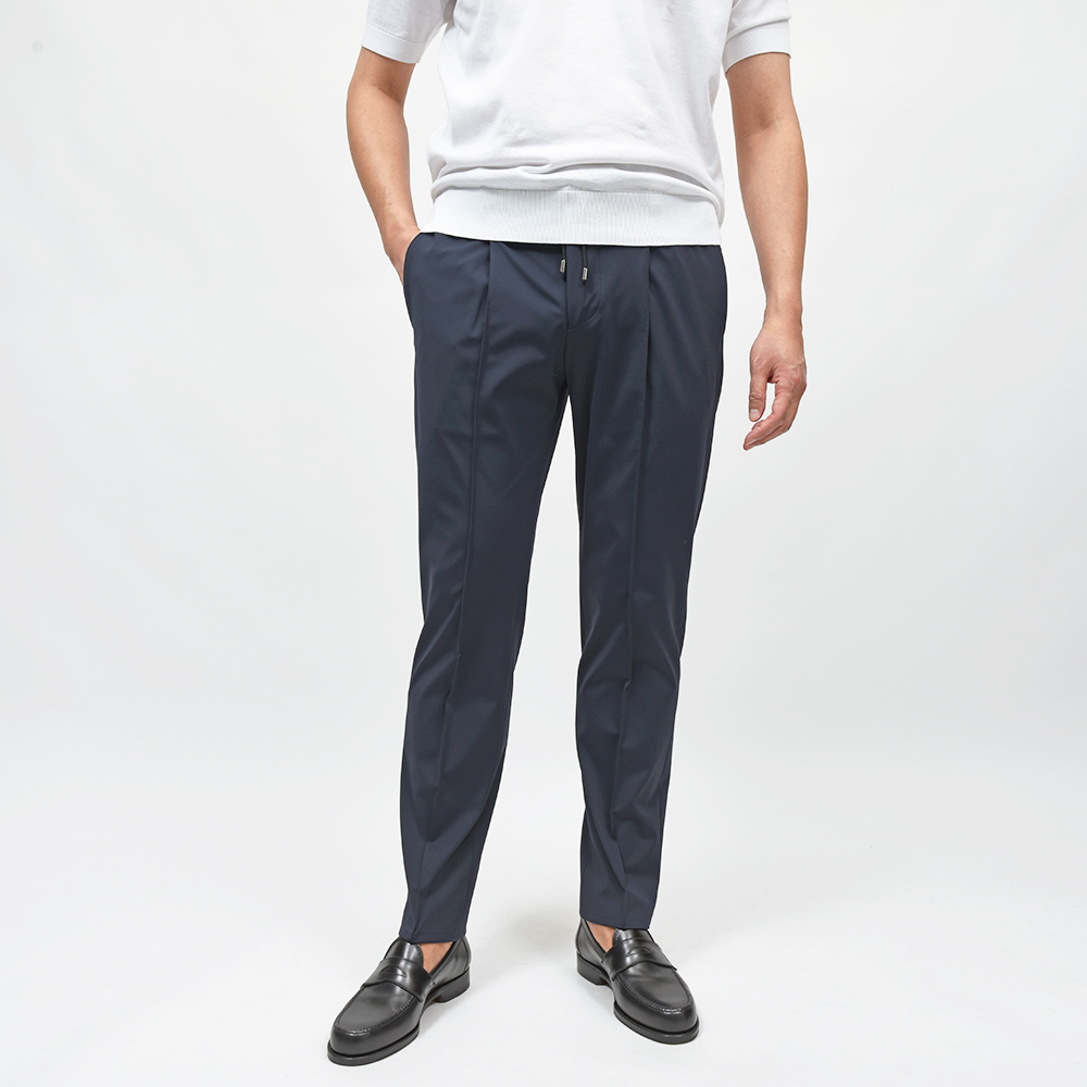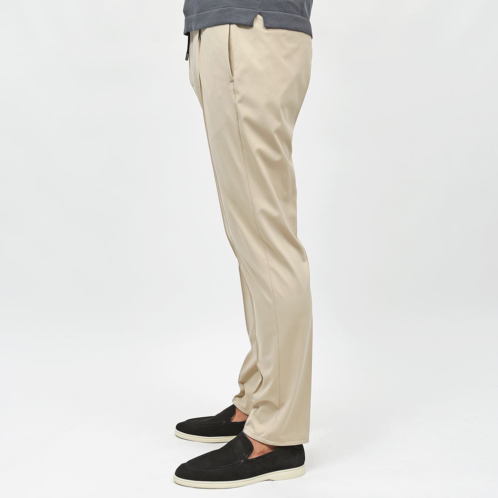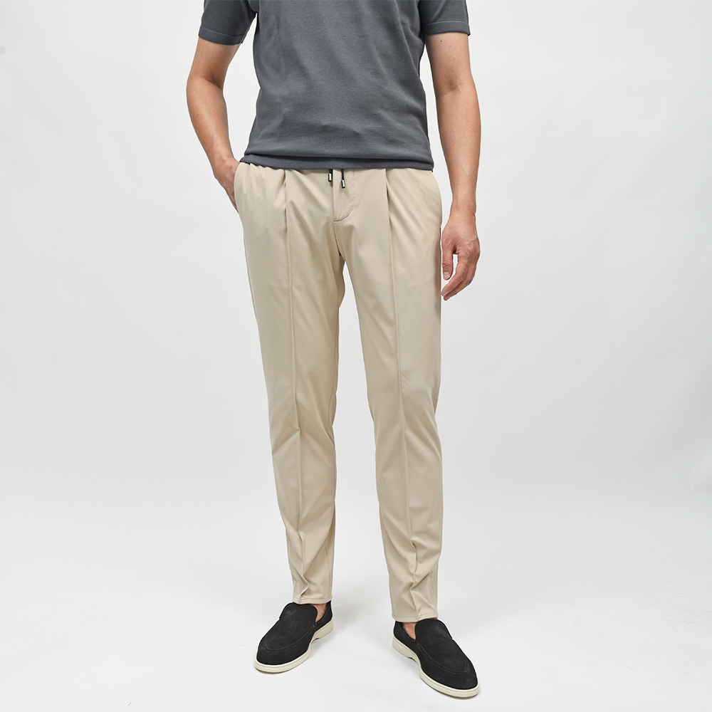 MASACCIOはフロントクリースをステッチで抑えることで、美しいラインがいつまでも続く永遠を約束された特別な一本です。ウエストのサイドにはゴムが入っており、ウエストは4cmほど伸縮してくれるリラックスした穿き心地。ドローコードは内側に隠すことができるため、ベルトを巻くとビジネスにも対応する、リラック顔にもドレス顔にも変化の効く万能なアイテムです。