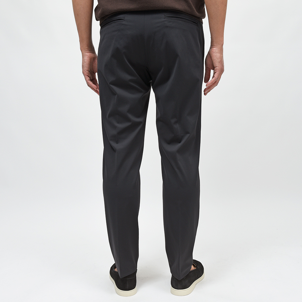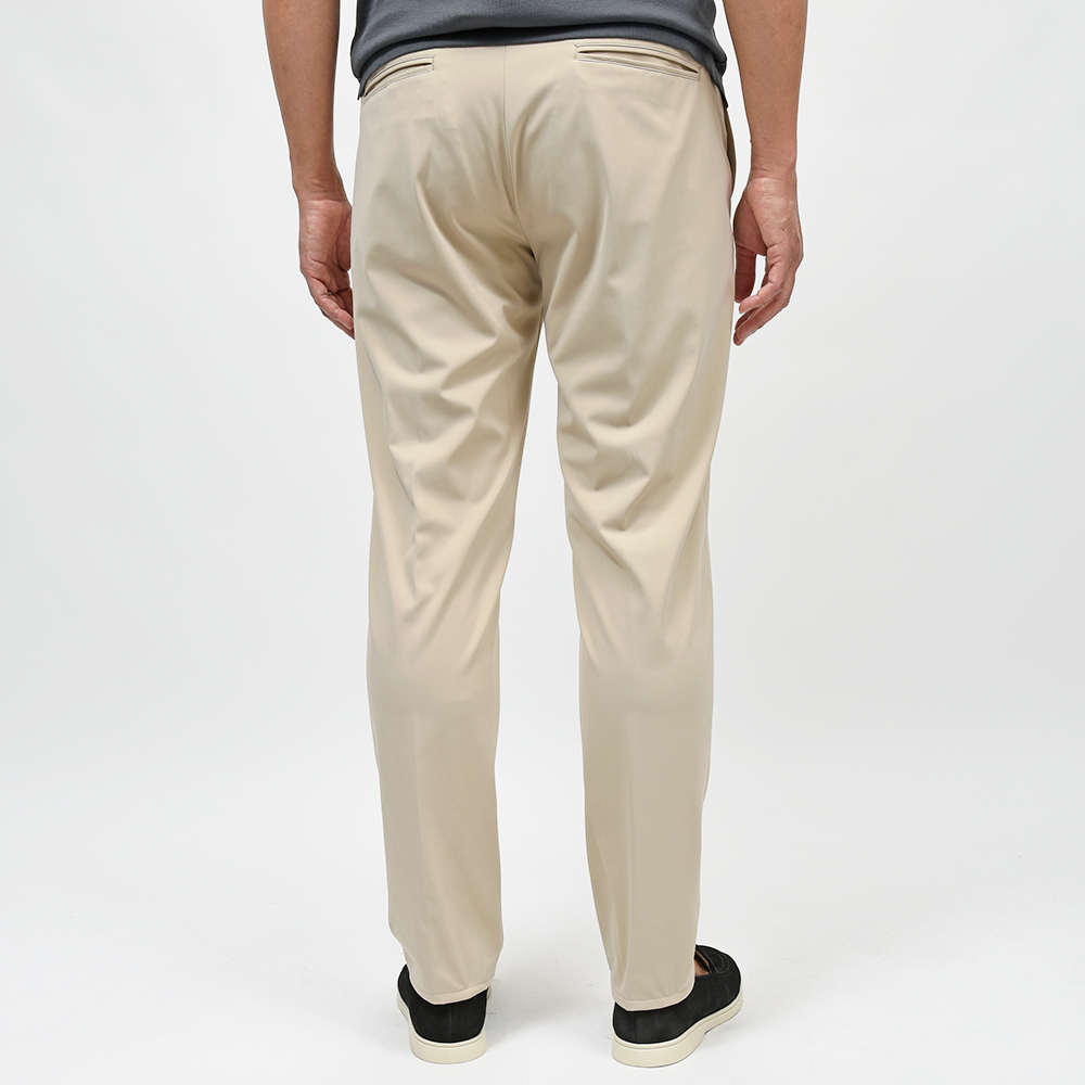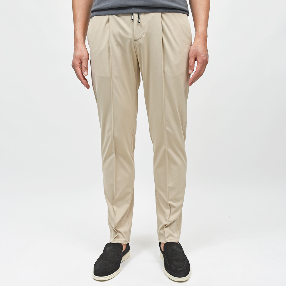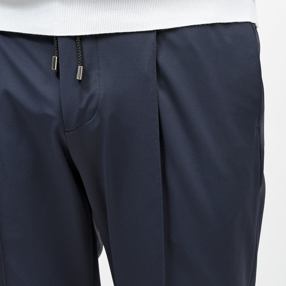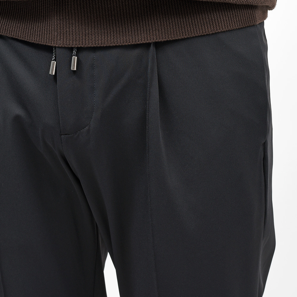 MASACCIOはフロントクリースをステッチで抑えることで、美しいラインがいつまでも続く永遠を約束された特別な一本です。ウエストのサイドにはゴムが入っており、ウエストは4cmほど伸縮してくれるリラックスした穿き心地。ドローコードは内側に隠すことができるため、ベルトを巻くとビジネスにも対応する、リラック顔にもドレス顔にも変化の効く万能なアイテムです。