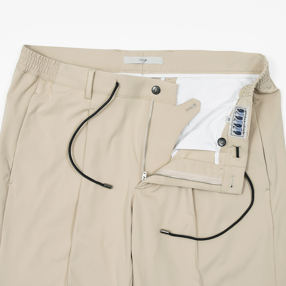 爆発的ヒットを記録したring初となるgiab's ARCHIVIO×ringの別注品、その名も“ring”。モデル名を決めかねていたバイヤー陣に対して、デザイナーの中新井氏の鶴の一声により決定した感慨深い一品です。そして、2020SSシーズンから“ring”をさらにアップデートした“ring2”が登場。1プリーツ入り“MASACCIO”のベースはそのままに、ドローコードをラグジュアリーな雰囲気が漂うイントレチャートに変更。さらに、マーベルトを-0.5cm幅を狭め、股上は+0.5cm深くすることでリラックス感が増しています。膝幅+0.5cmとそれぞれハーフサイズアップし、ふくらはぎの突っ張りを軽減しました。