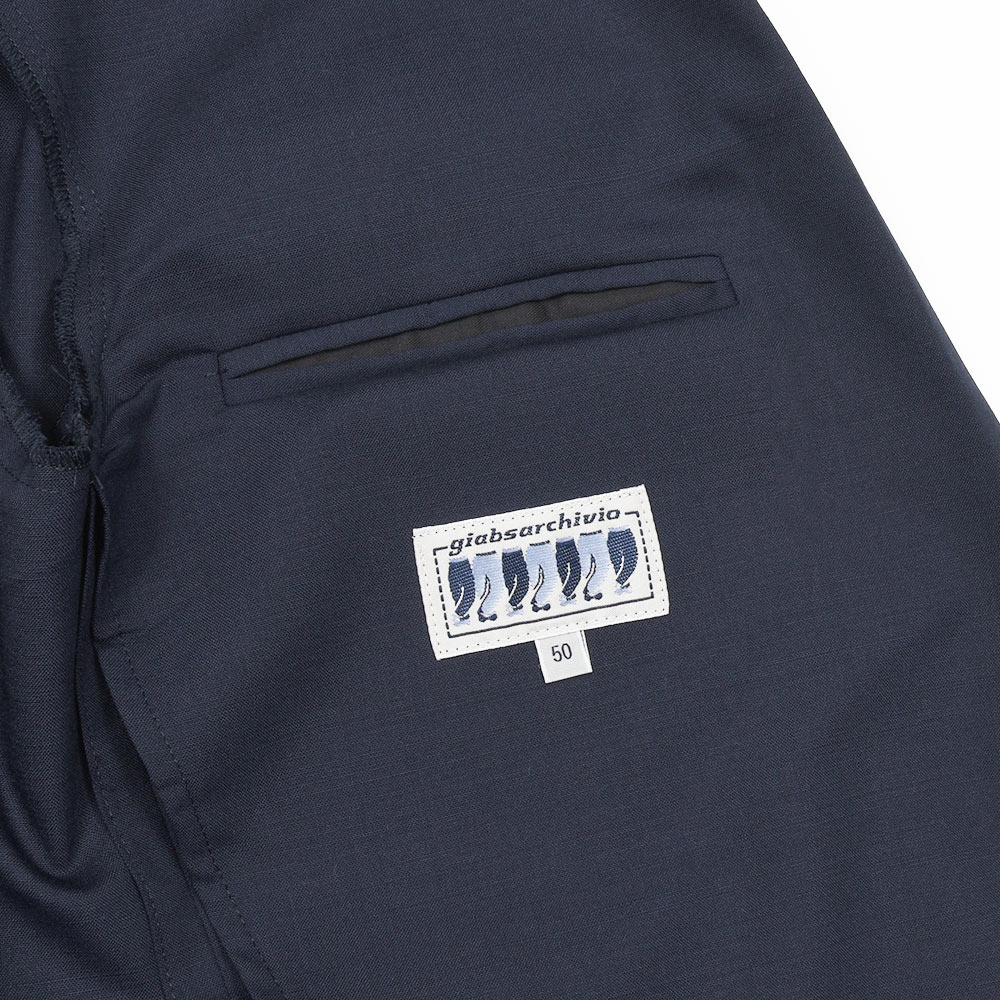 giabsarchivioのジャケットラインのモデル“STROZZI(ストロッツィ)”。イージーなパンツを得意とするブランドですので、ドレスライクなジャケットではなく、アンコンで裏地もない筒袖仕上げで、ややボックスシルエットという、あくまでも気軽に羽織れる仕上がりとなっています。しかしながら、現代の実情を見ているとこのくらいのジャケットで十分というシーンはよくある事ですので、ディレクターの中新井氏らしい痒い所に手が届く一品です。