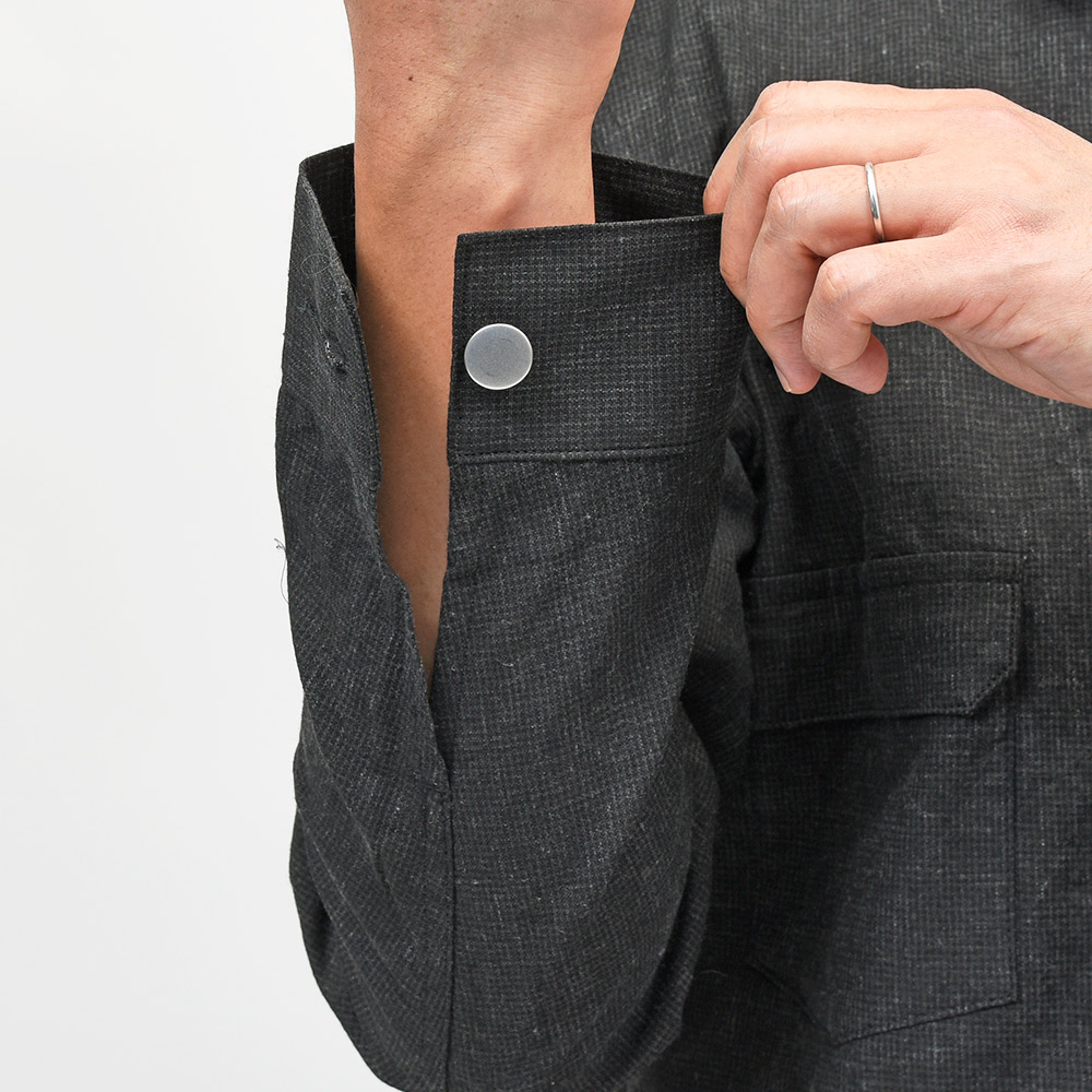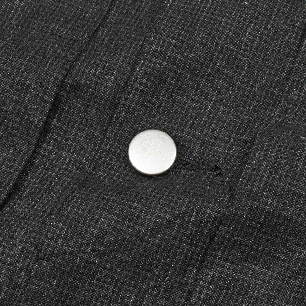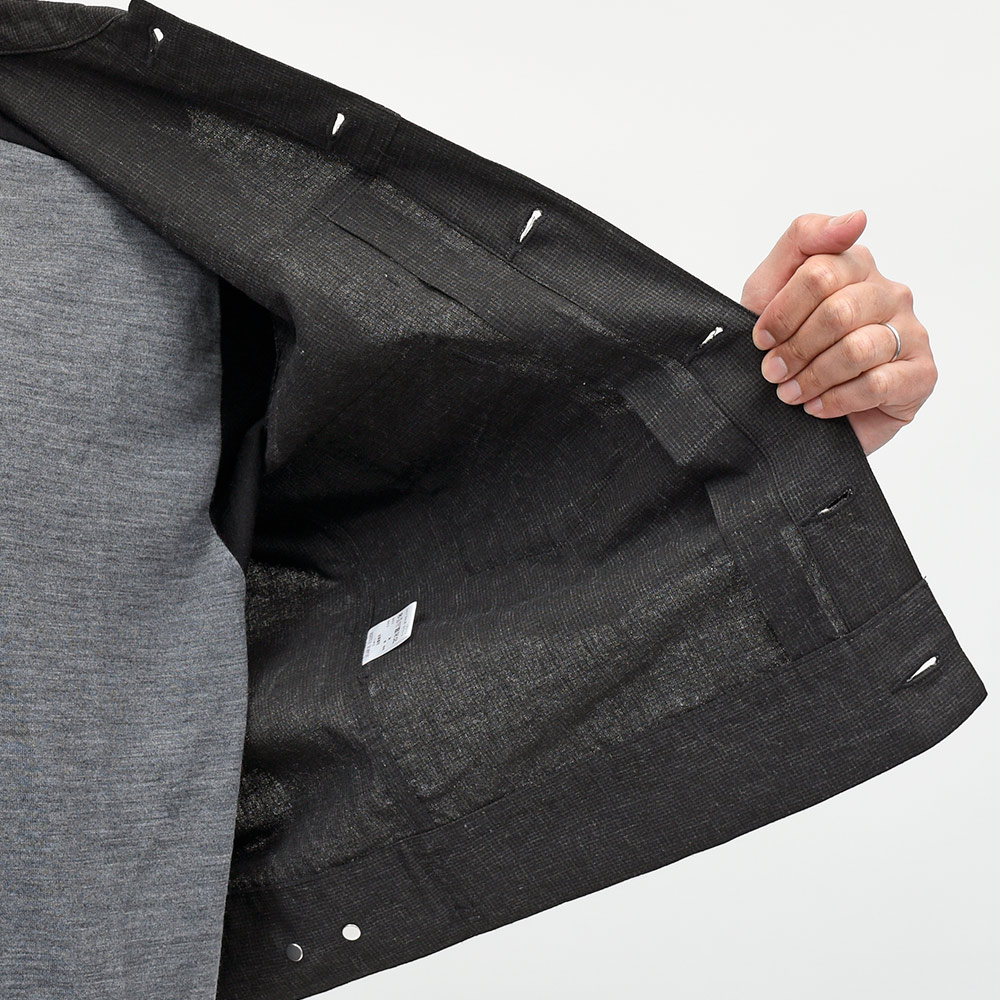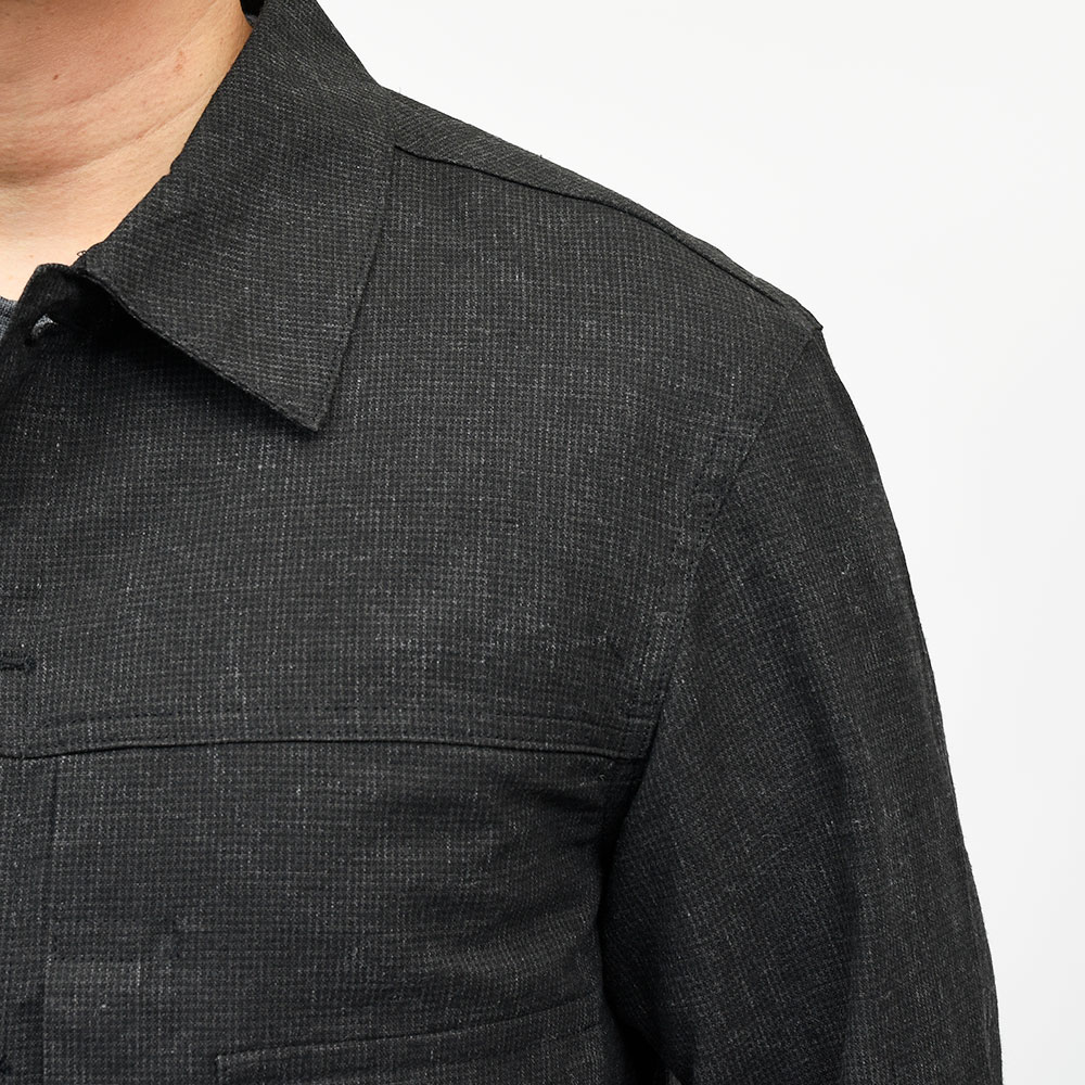 両胸ポケットのボタンに、左胸ポケットのブランドネームタグを排し、使用されているボタンも刻印などのない未気質なデザイン。それらによってビンテージライクではなく、あくまで現代的な表情が生まれ、モダンなスタイルを作り上げてくれます。また、肩付けにテーラードの技術を採用することで前振り袖となっており、肩周りの可動域が確保された抜群の着心地となっています。