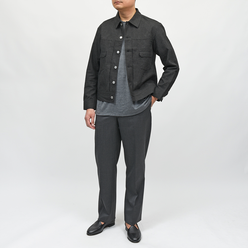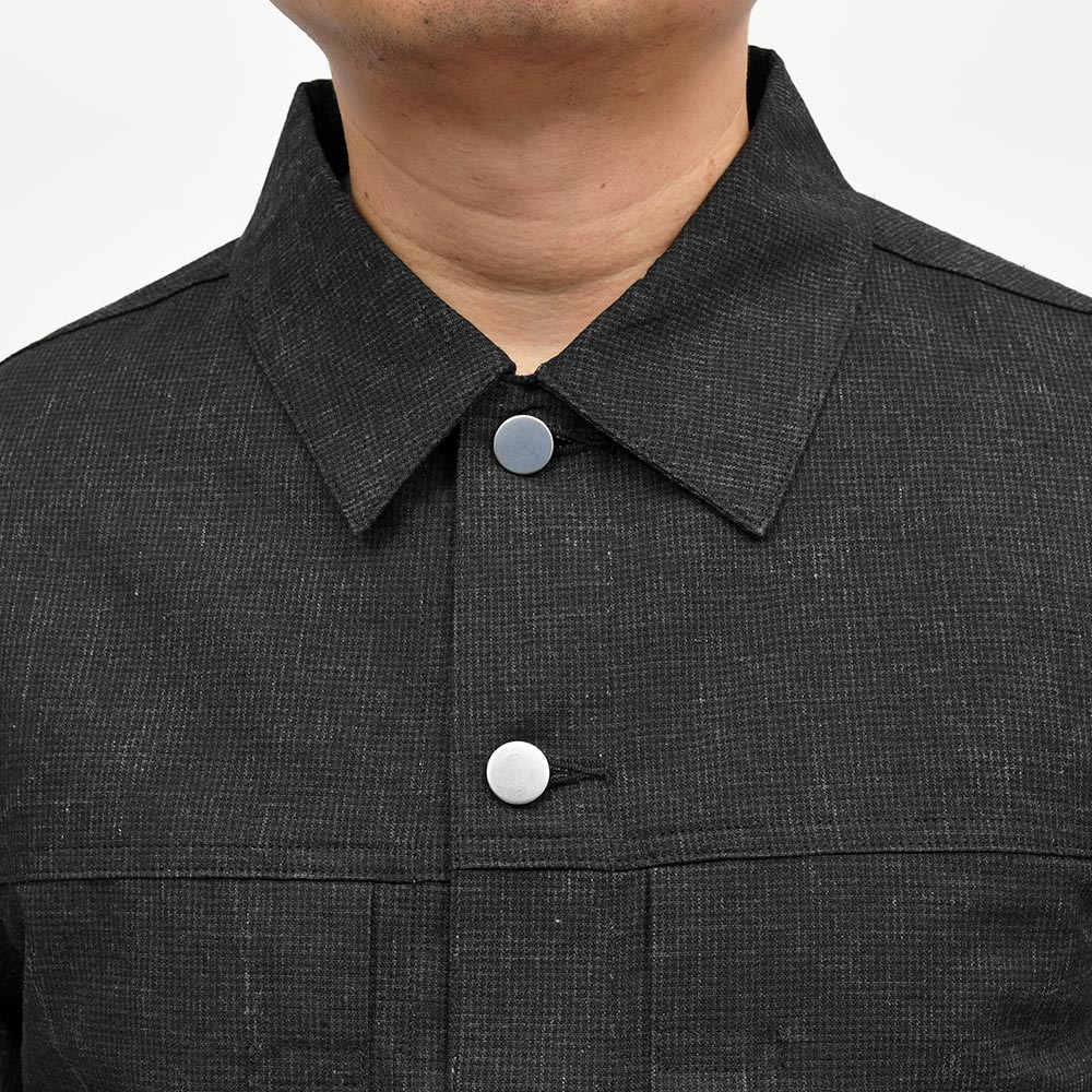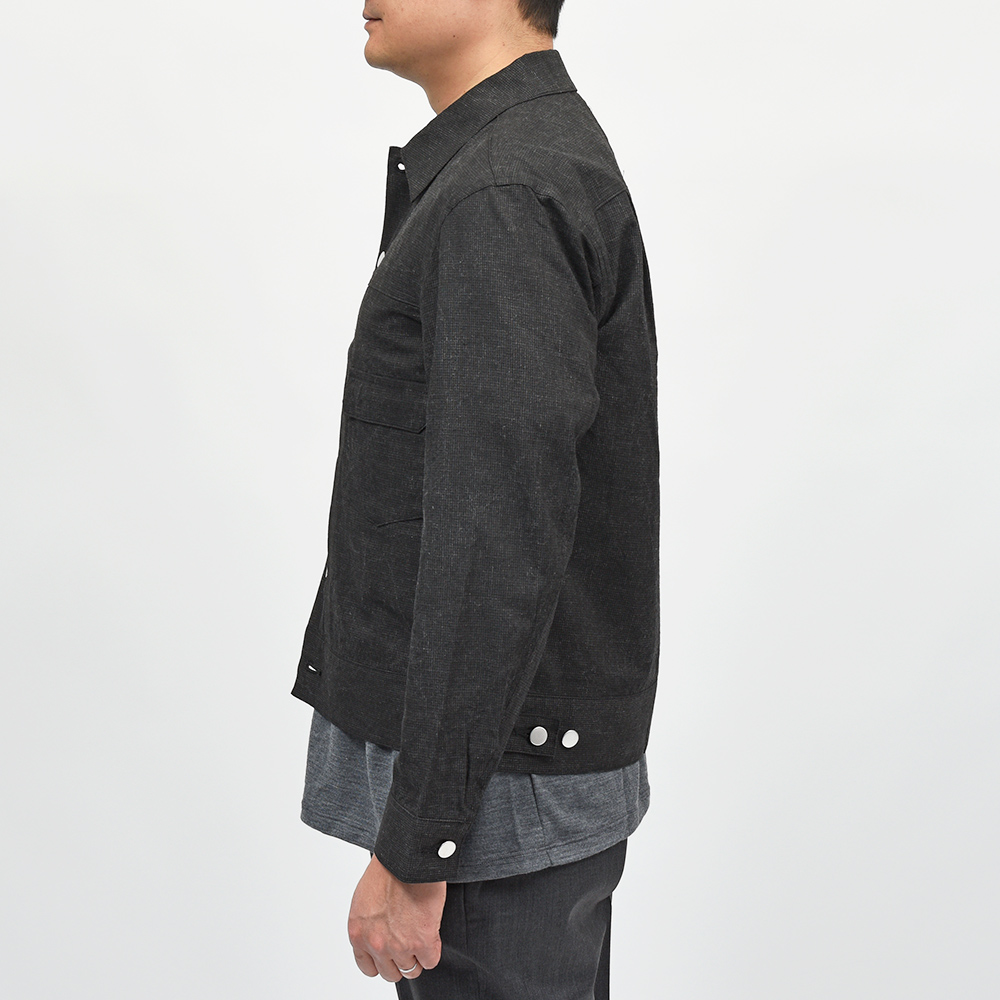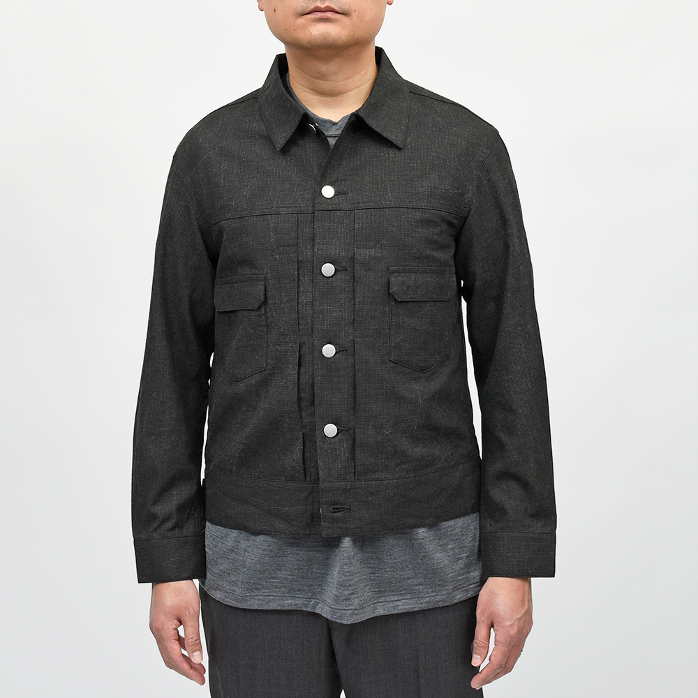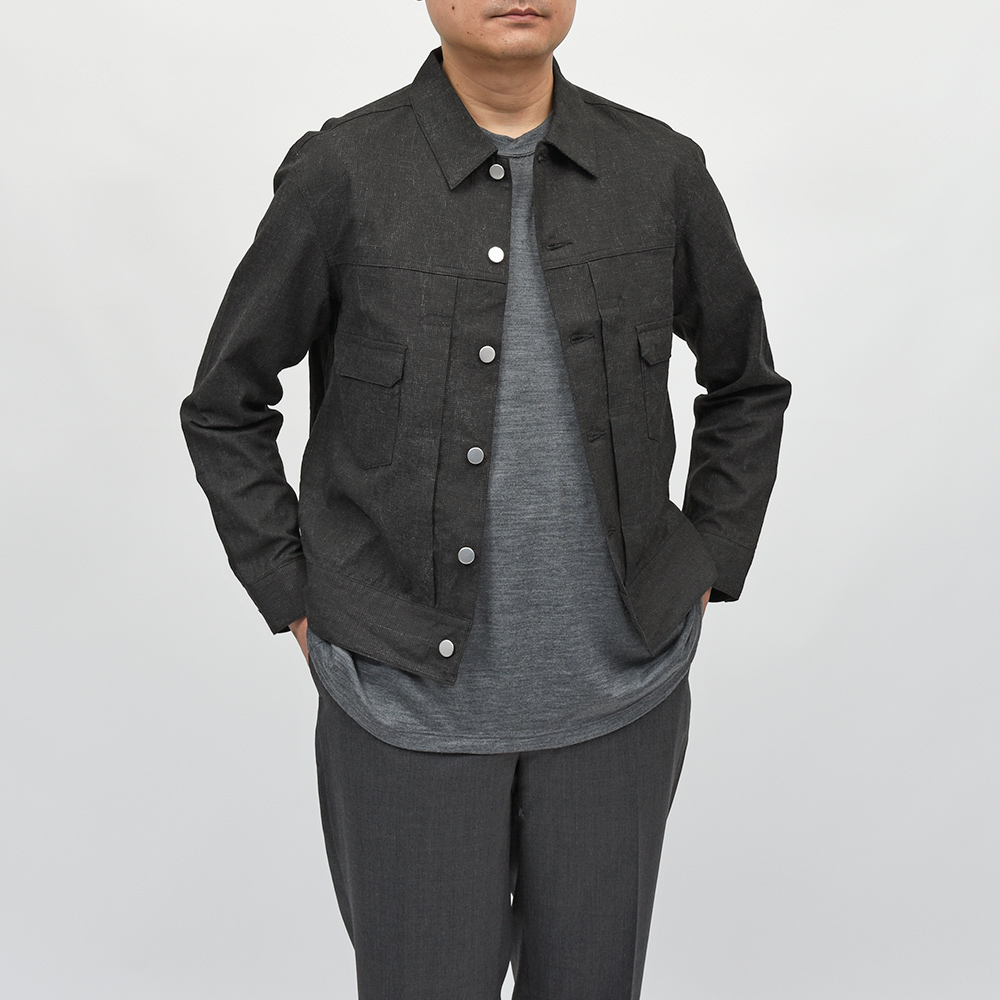 両胸ポケットのボタンに、左胸ポケットのブランドネームタグを排し、使用されているボタンも刻印などのない未気質なデザイン。それらによってビンテージライクではなく、あくまで現代的な表情が生まれ、モダンなスタイルを作り上げてくれます。また、肩付けにテーラードの技術を採用することで前振り袖となっており、肩周りの可動域が確保された抜群の着心地となっています。