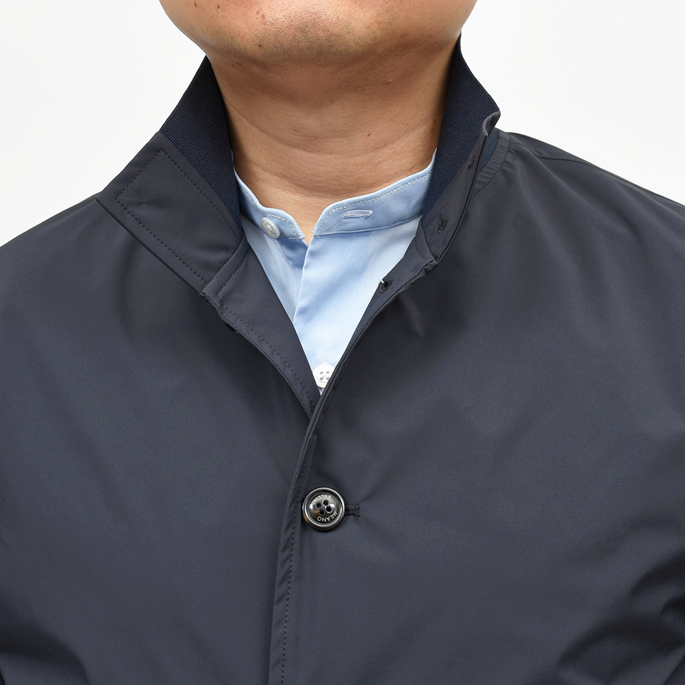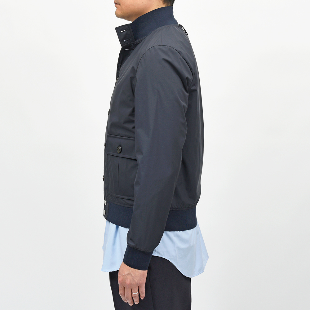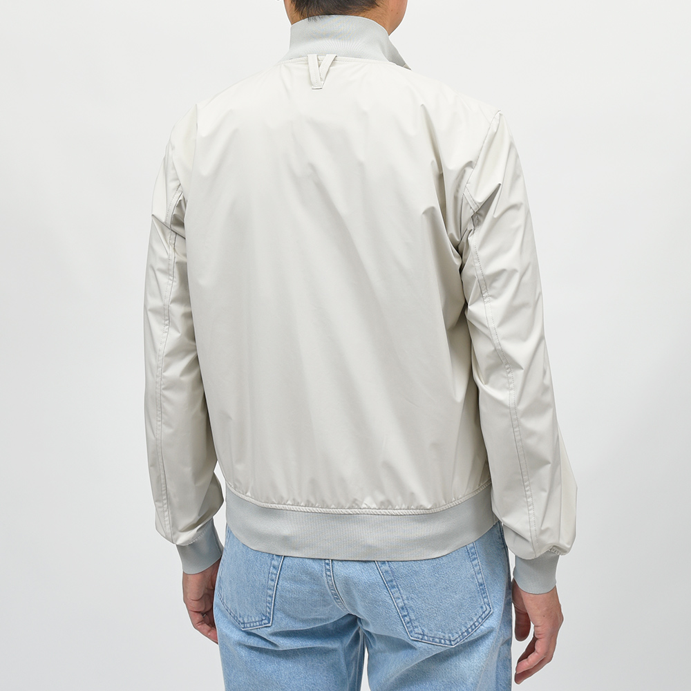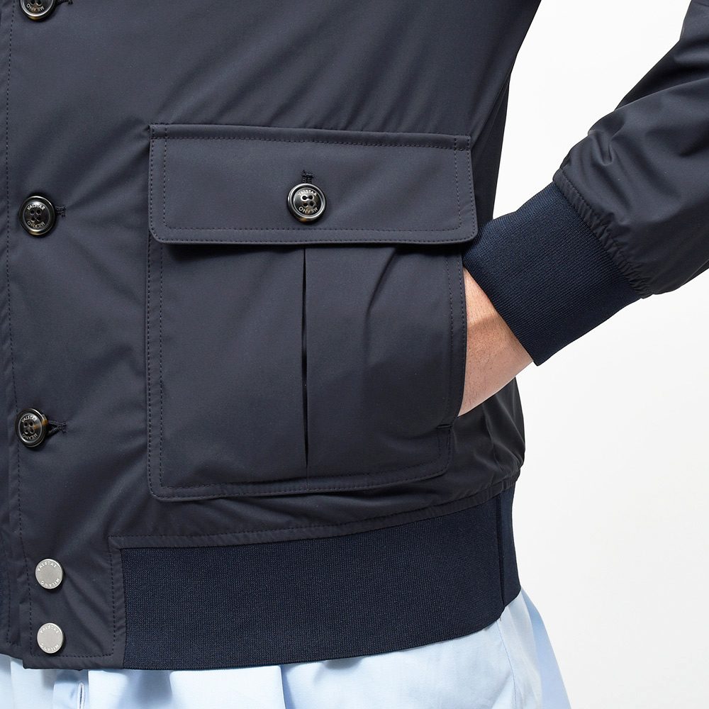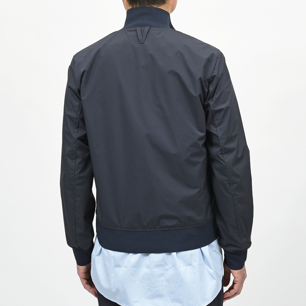 こちらは、撥水性と通気性を備えた超軽量ポリエステル素材を使用。シワにもなりにくく、リブも通常よりも薄手のものを使用していますので、右前身頃の裏地に取り付けられているポケットに折り畳んで収納することができ、パッカブルとしても非常に重宝する一品です。