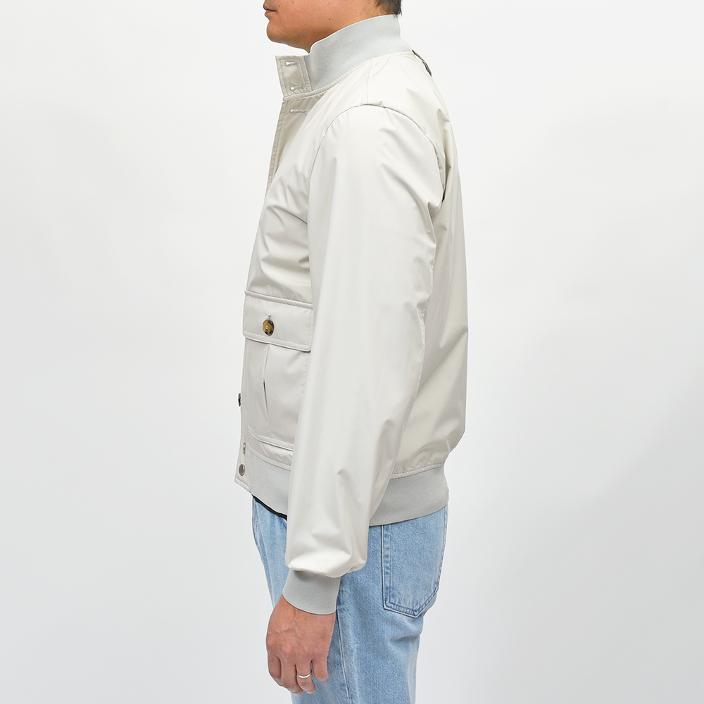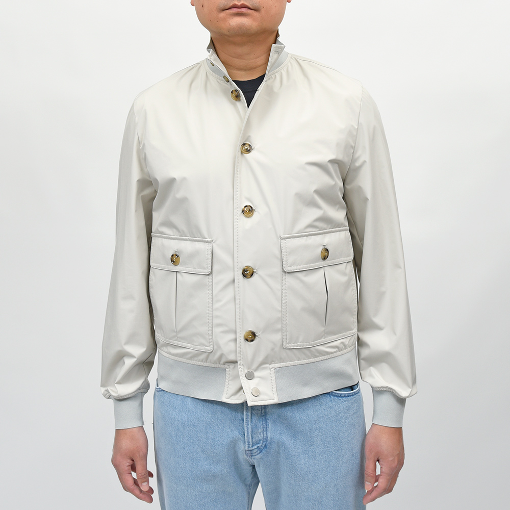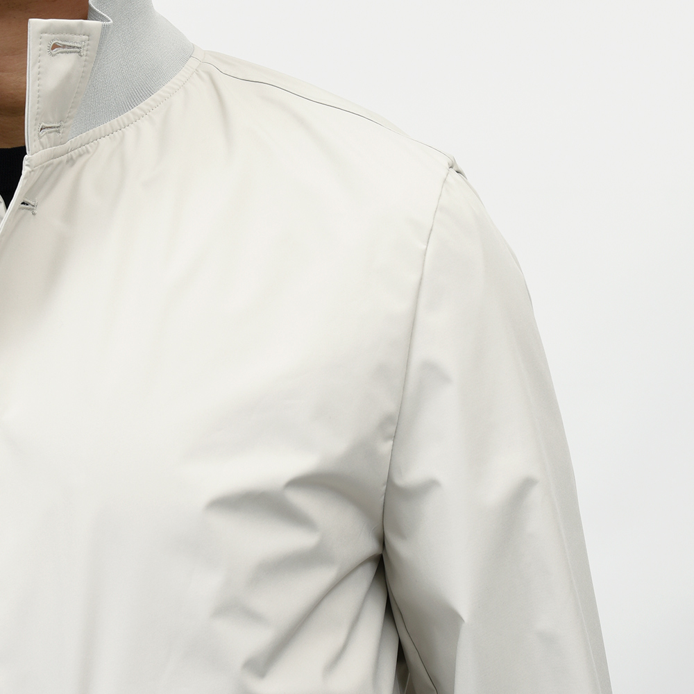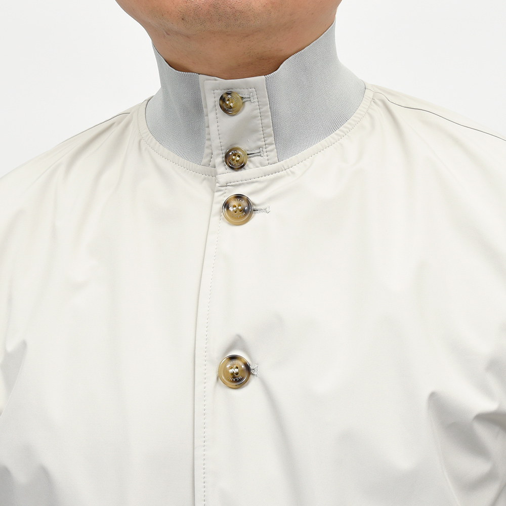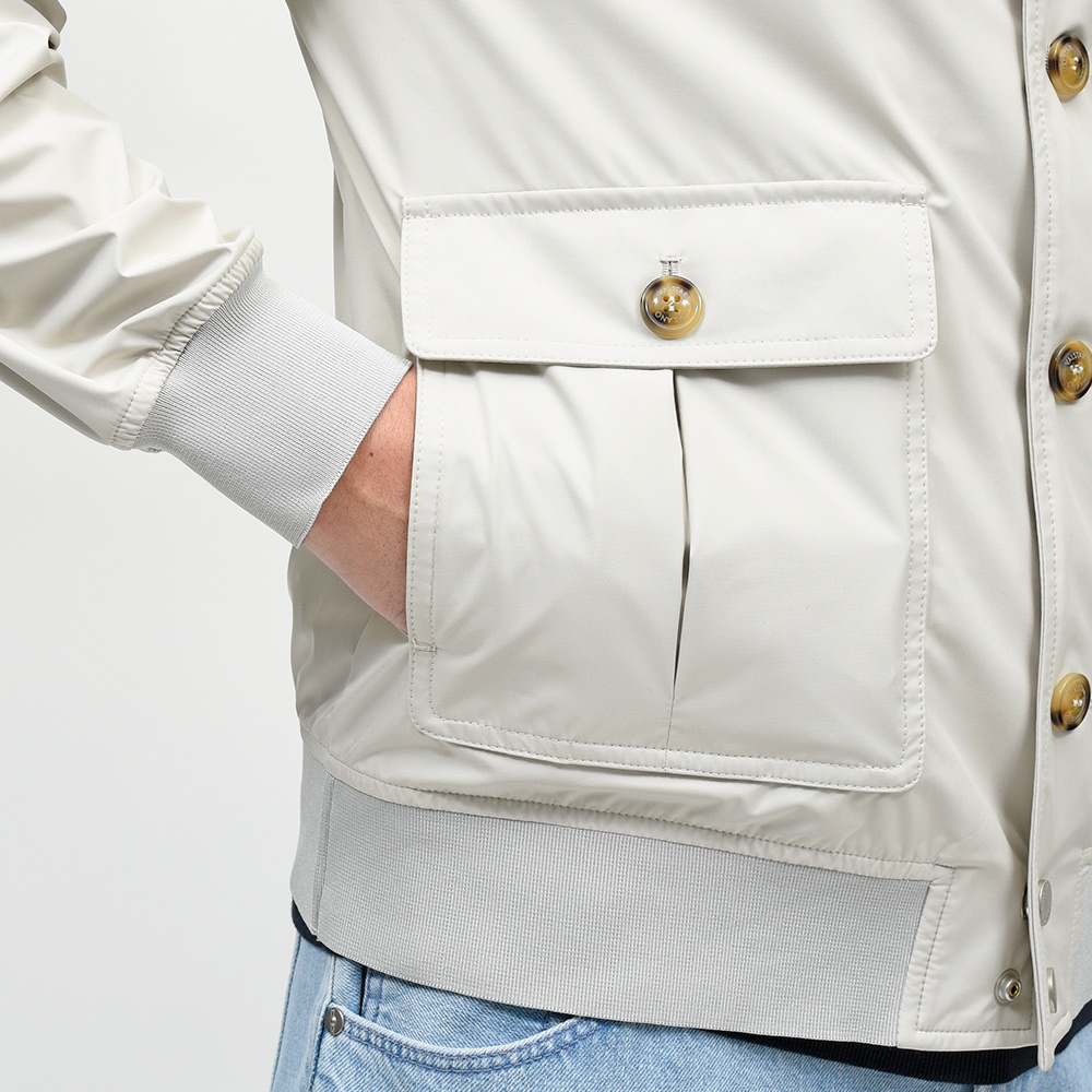 こちらは、撥水性と通気性を備えた超軽量ポリエステル素材を使用。シワにもなりにくく、リブも通常よりも薄手のものを使用していますので、右前身頃の裏地に取り付けられているポケットに折り畳んで収納することができ、パッカブルとしても非常に重宝する一品です。