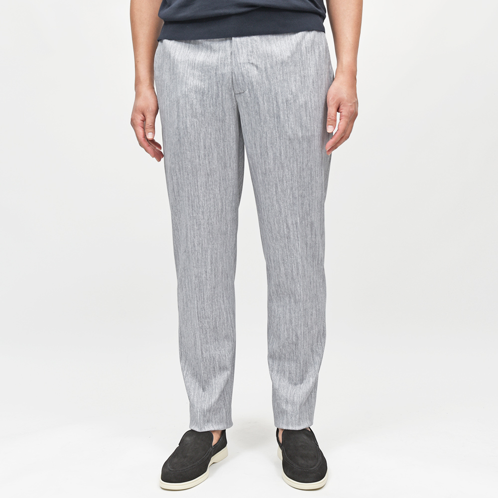 サイズは48でジャストサイズです。ノープリーツでスッキリとしていますが細すぎず適度なゆとりのあるパンツです。掠れたようなメランジの柄をプリントしたジャージースラックスです!