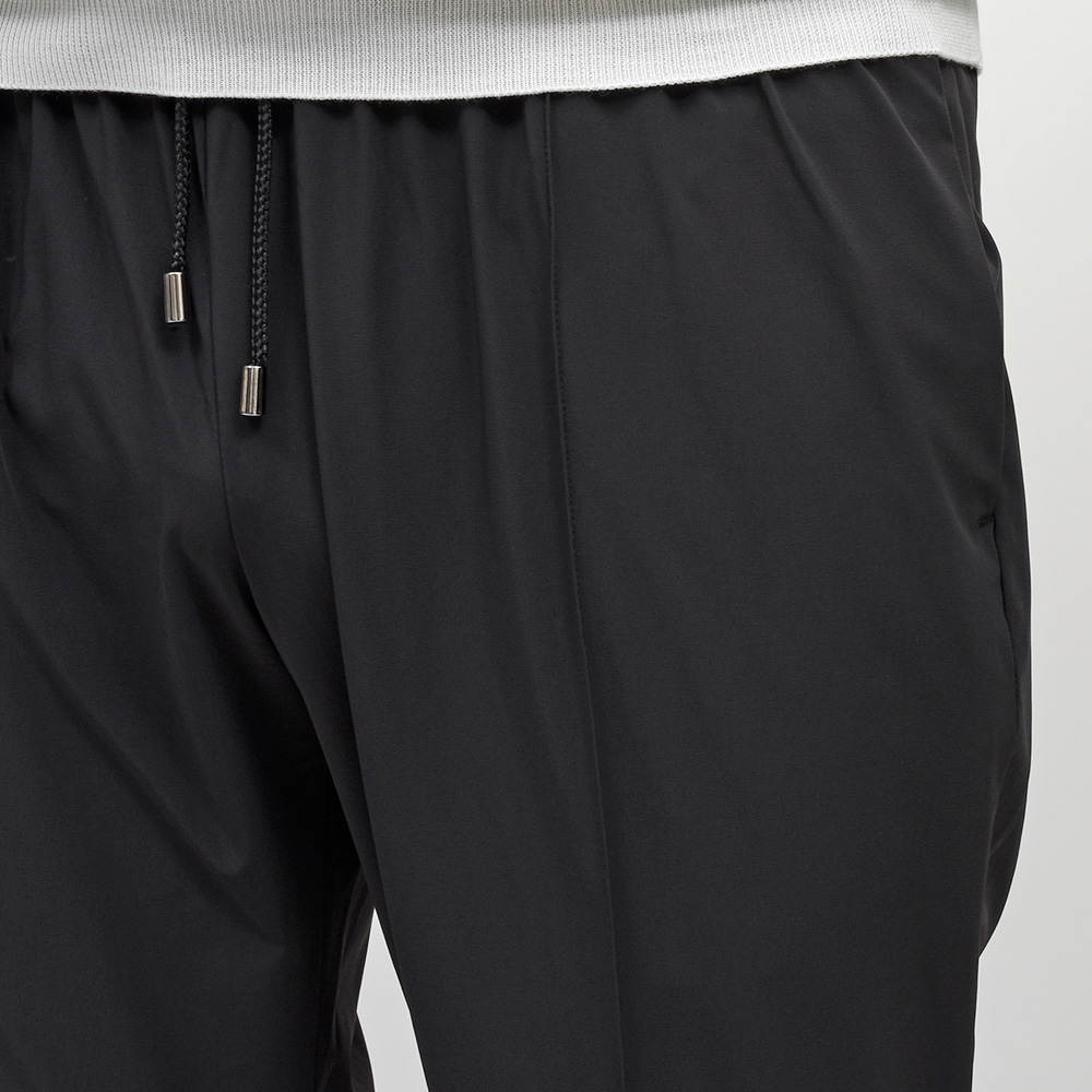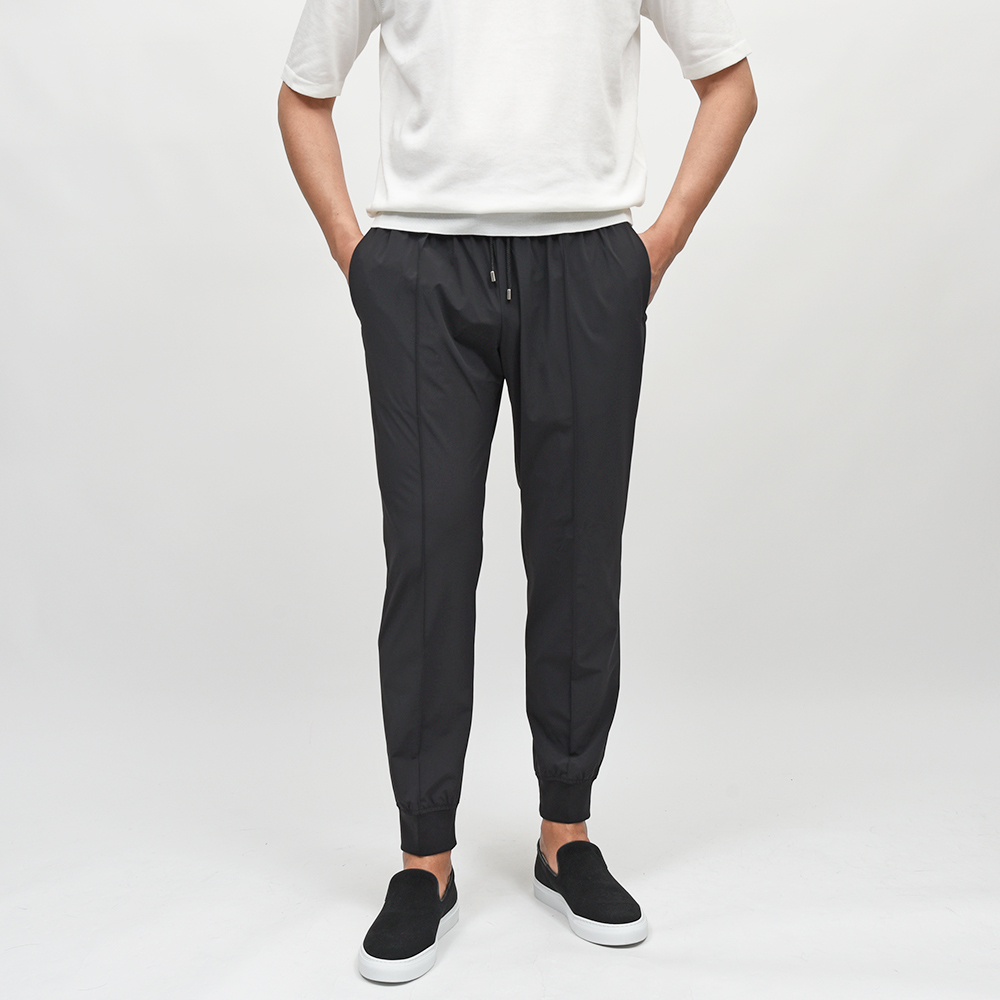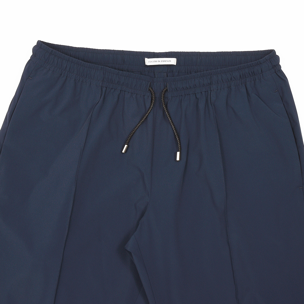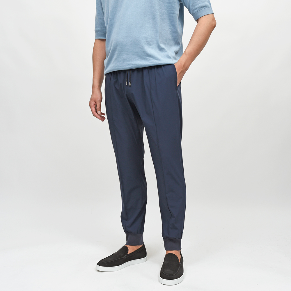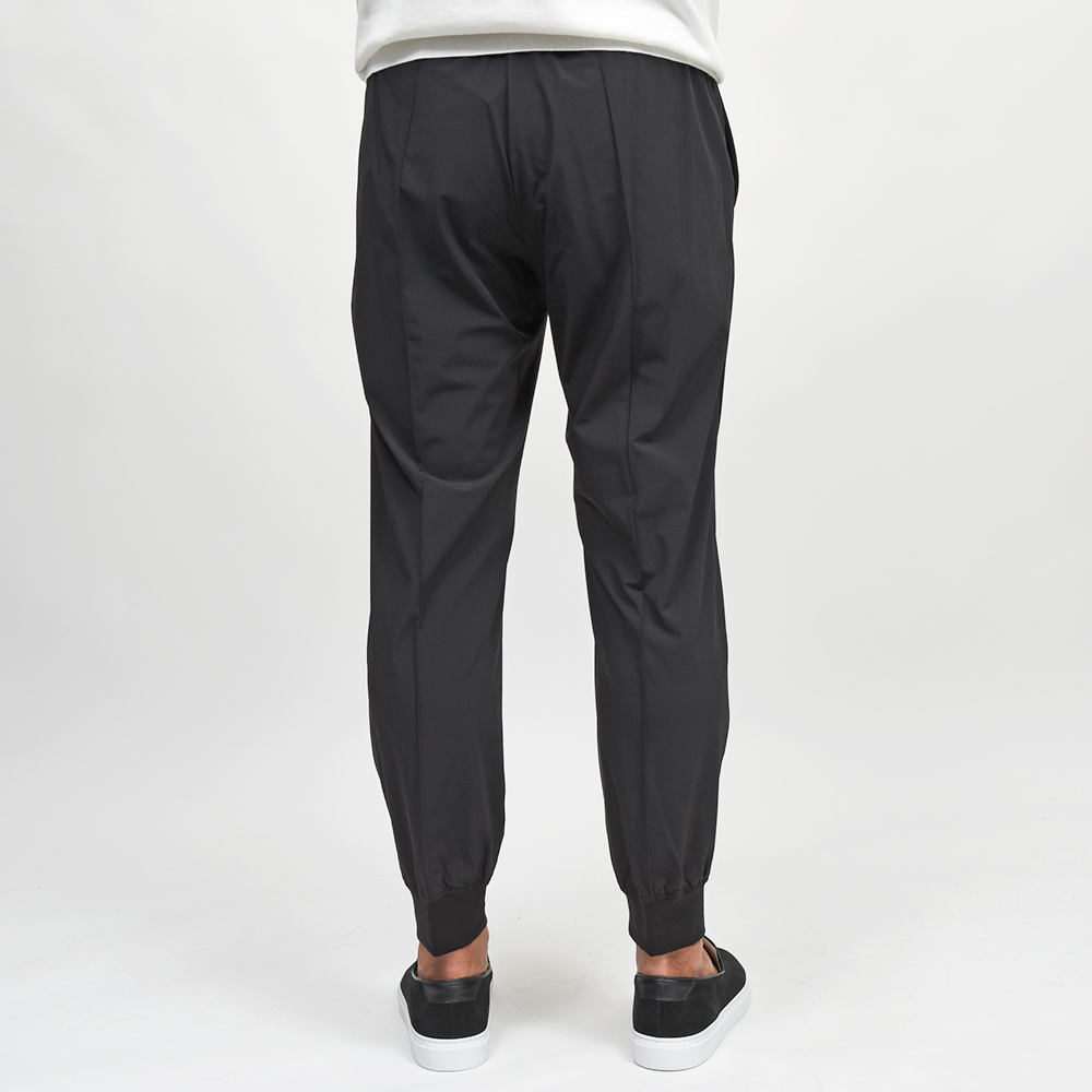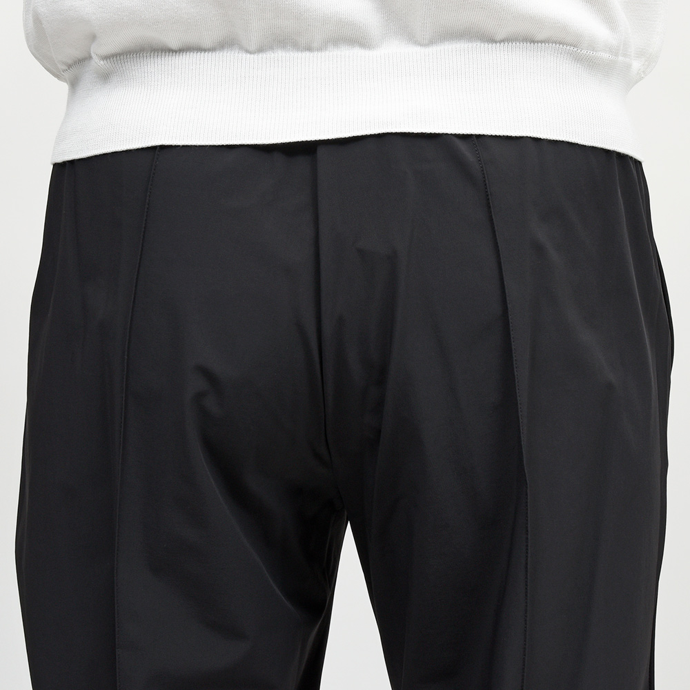 フルシャーリングにドローコードを備え付けたモデル“MANFREDO(マンフレッド)”。腰回りから膝にかけてゆとりのあるリラックスしたシルエットに、膝から下は緩めにかけられたテーパードが大人の上品さを持ちます。こちらはMANFREDOをベースに、裾口をリブ仕様に変更し、また前後にココンチの代名詞とも言える永久クリースを施しています。