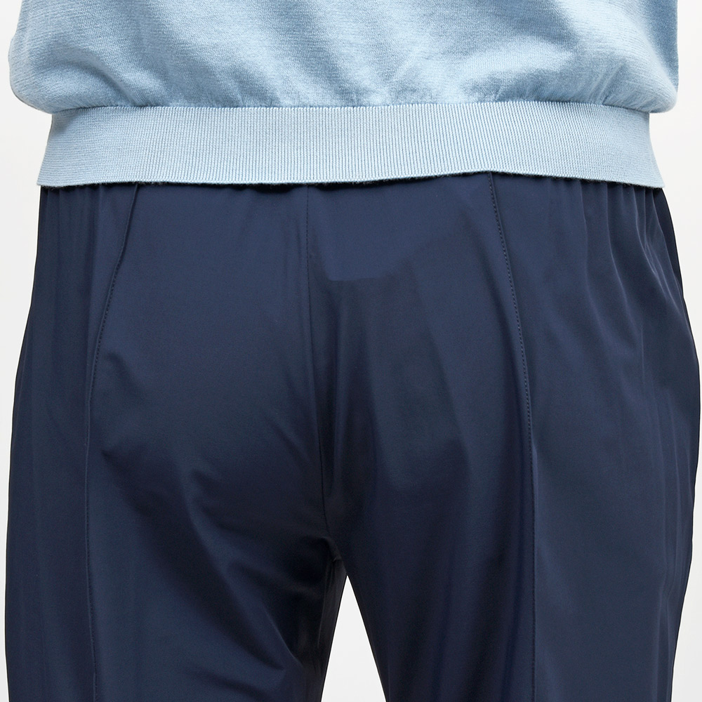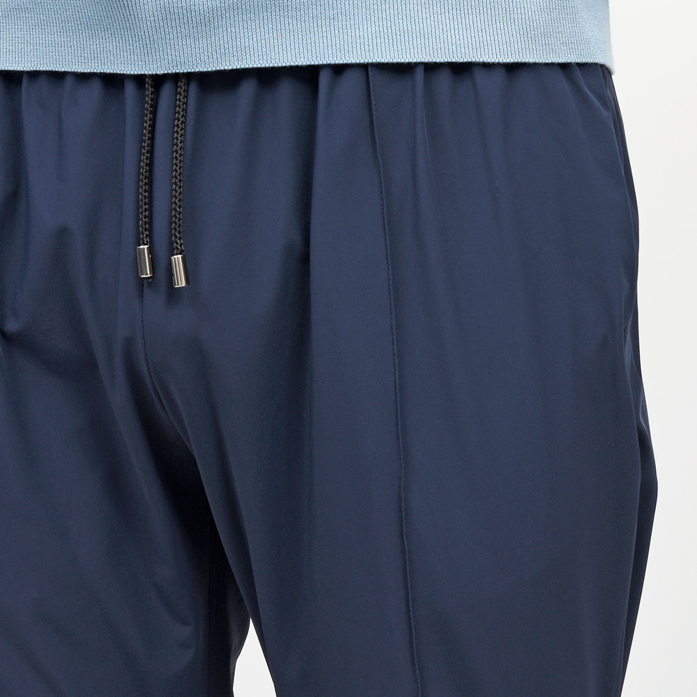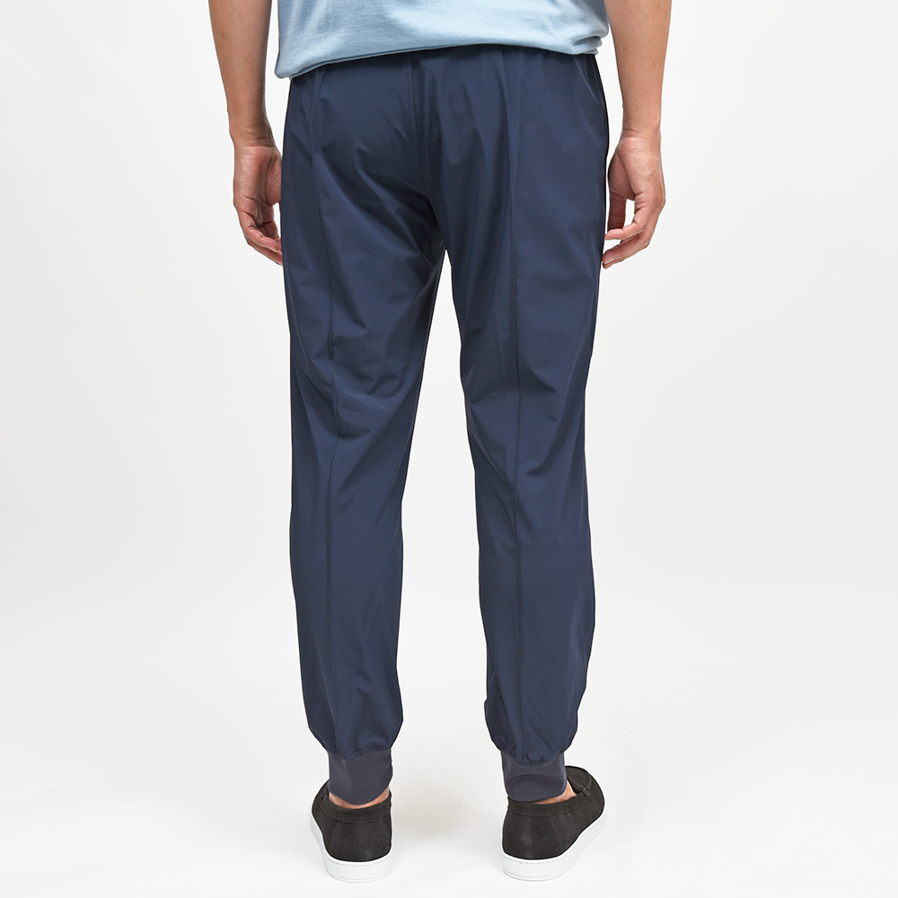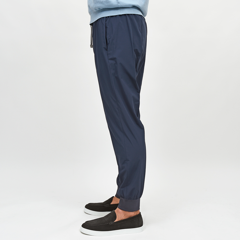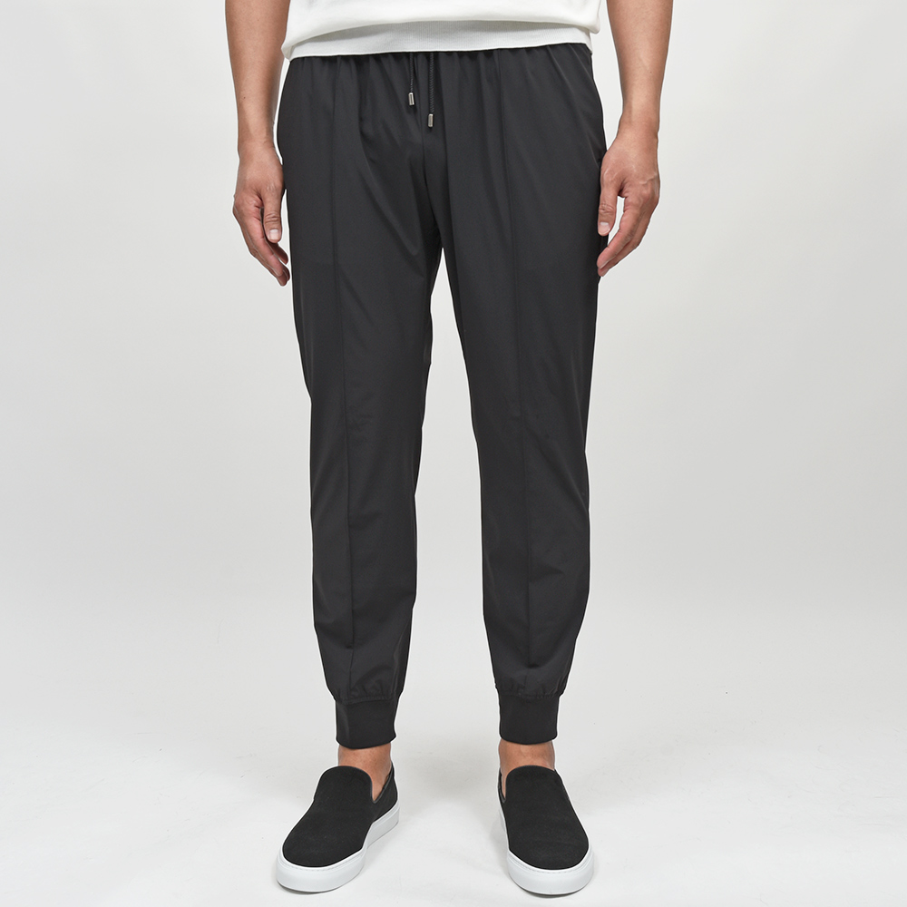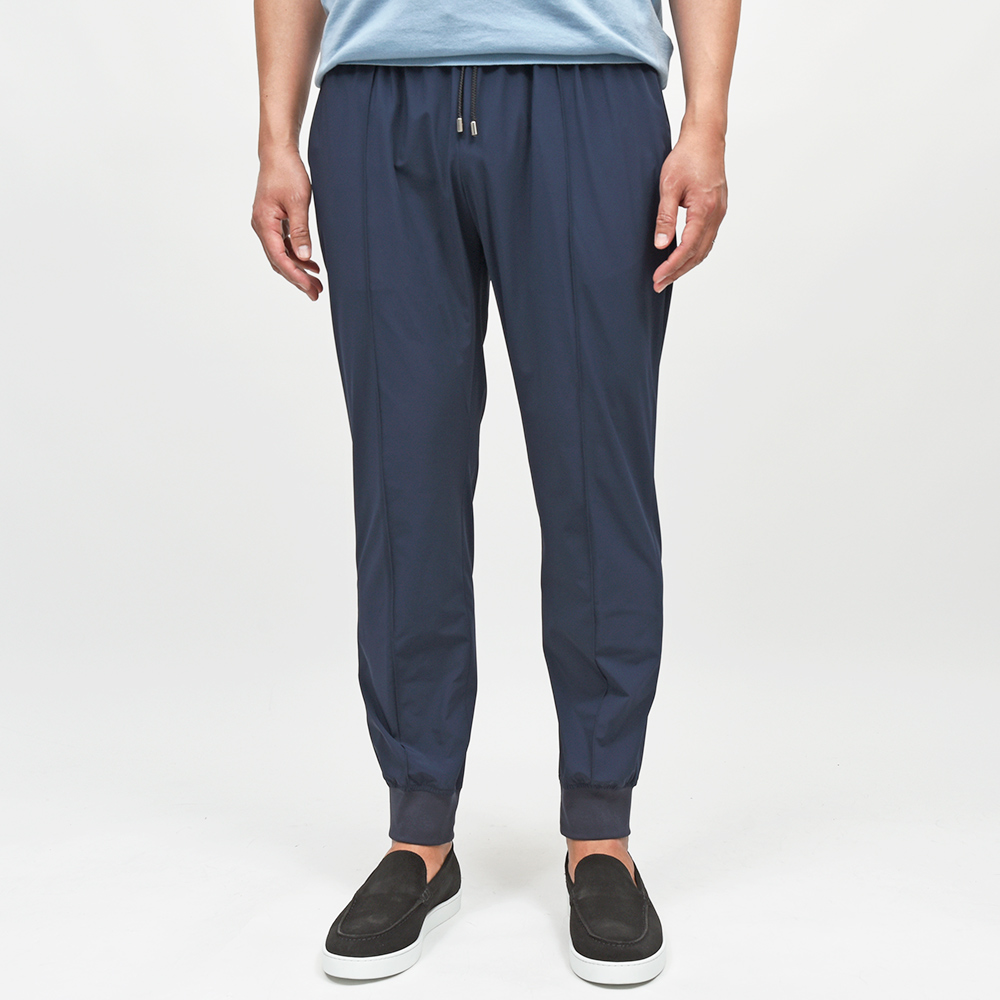 フルシャーリングにドローコードを備え付けたモデル“MANFREDO(マンフレッド)”。腰回りから膝にかけてゆとりのあるリラックスしたシルエットに、膝から下は緩めにかけられたテーパードが大人の上品さを持ちます。こちらはMANFREDOをベースに、裾口をリブ仕様に変更し、また前後にココンチの代名詞とも言える永久クリースを施しています。