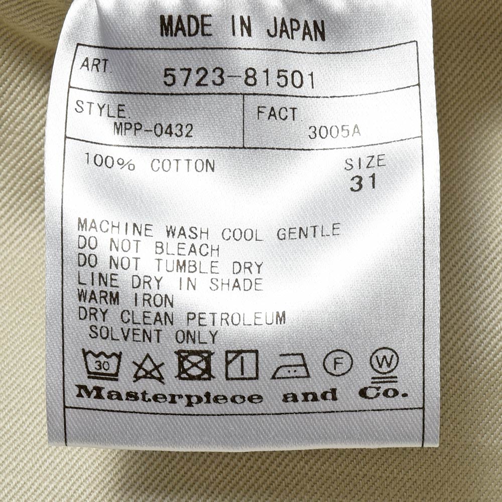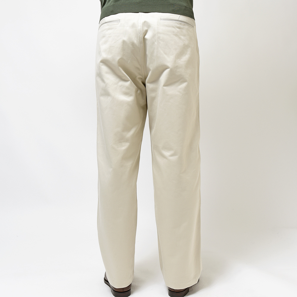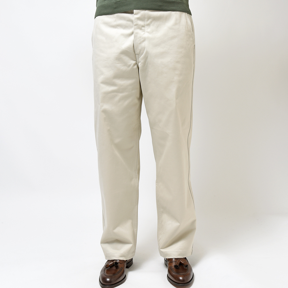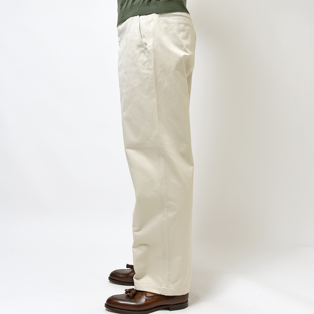 腰回りは程よくフィット感を与え、太めの渡り方ほのかにテーパードさせたシルエットのチノトラウザーになります。