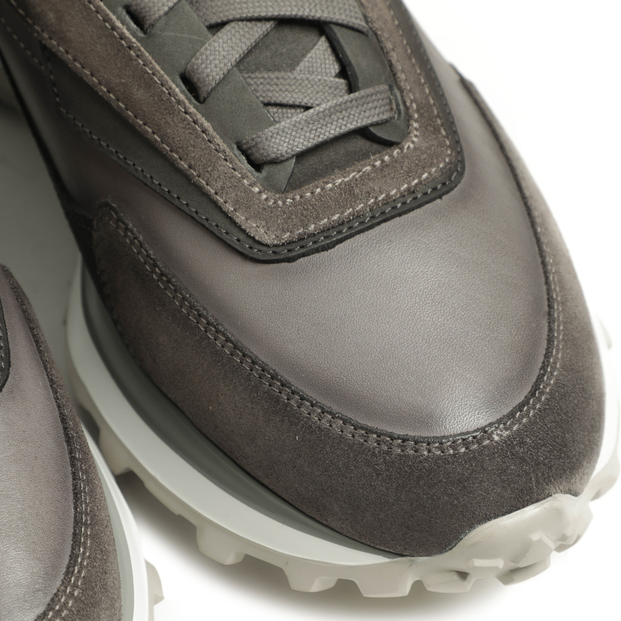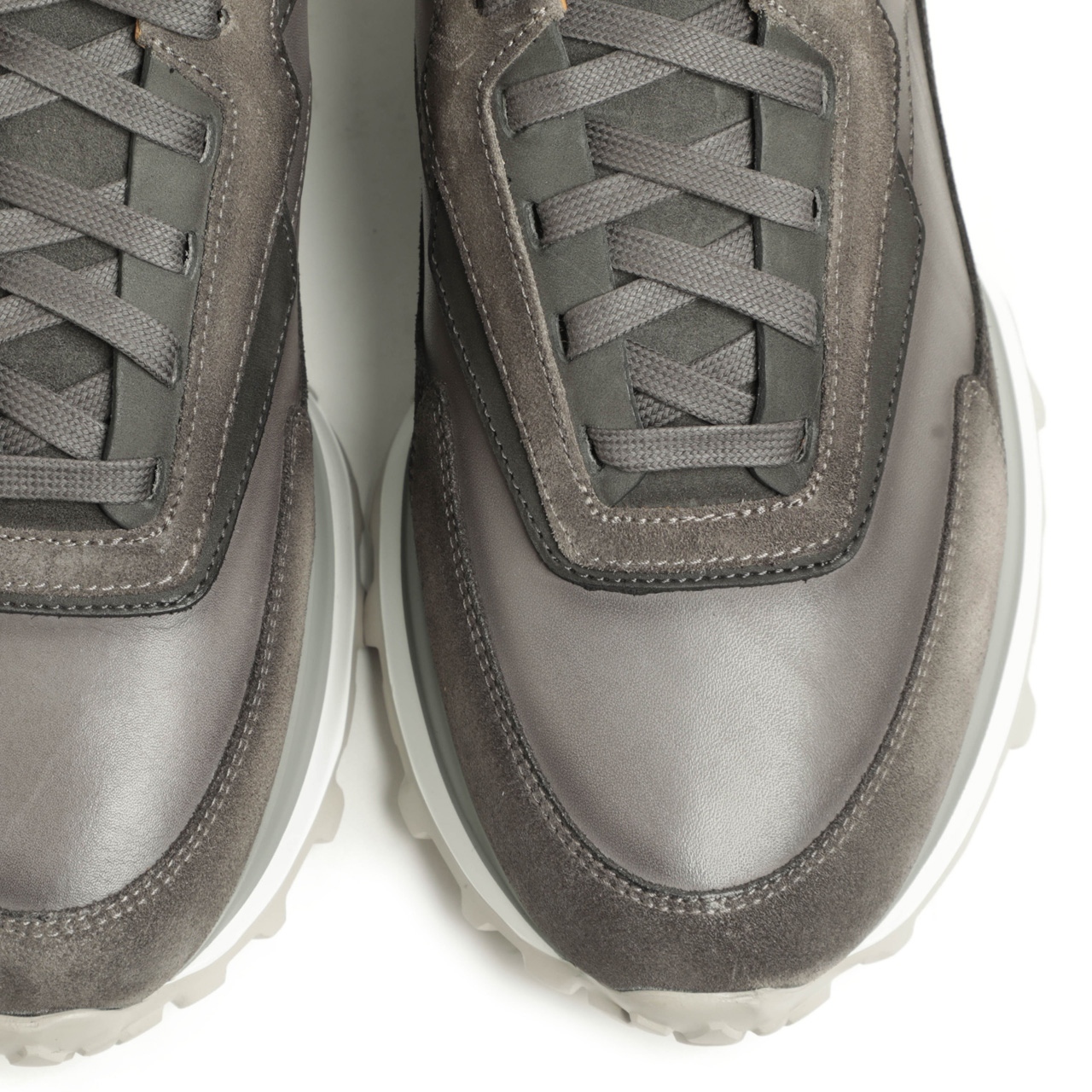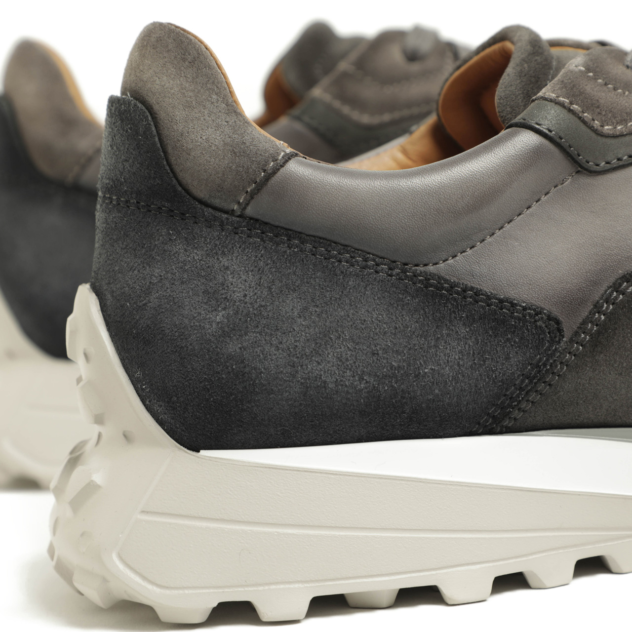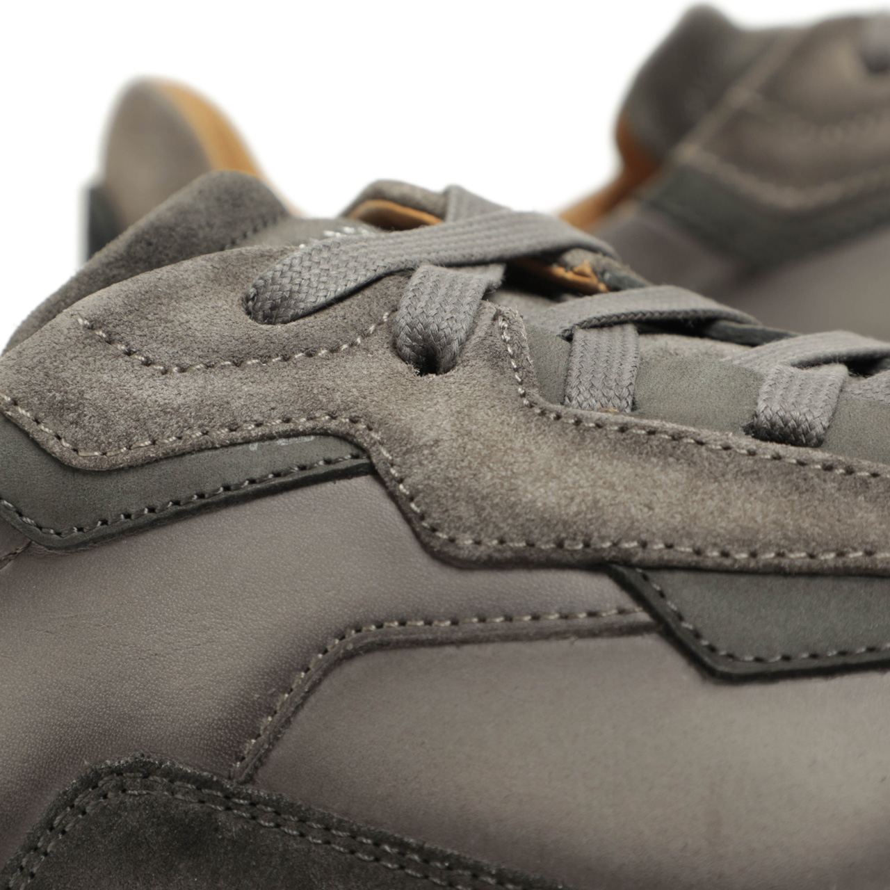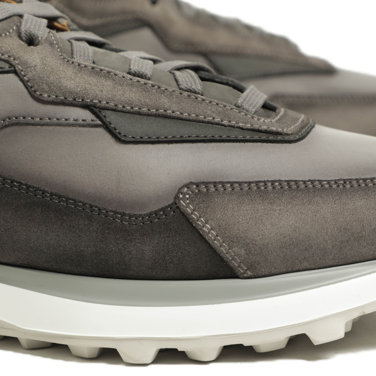その決め手は素材。レザーとスエードをの切り替えで表現したアッパーは、ドレスシューズに使っても遜色のないきめ細かな質感。艶・程よい張りのあるシュリンクレザー、グレーはスムースレザーを使用しております。アイレット部分、トゥからサイドの補強部分をスエードで切り替え、艶のあるレザーとマットなスエードのコントラストが足元にアクセントを加えてくれます。