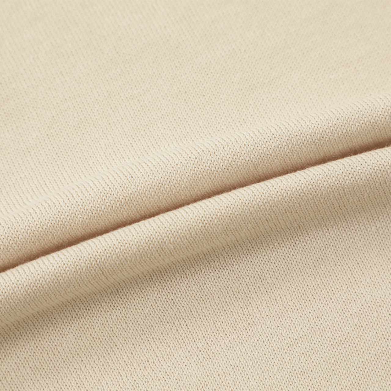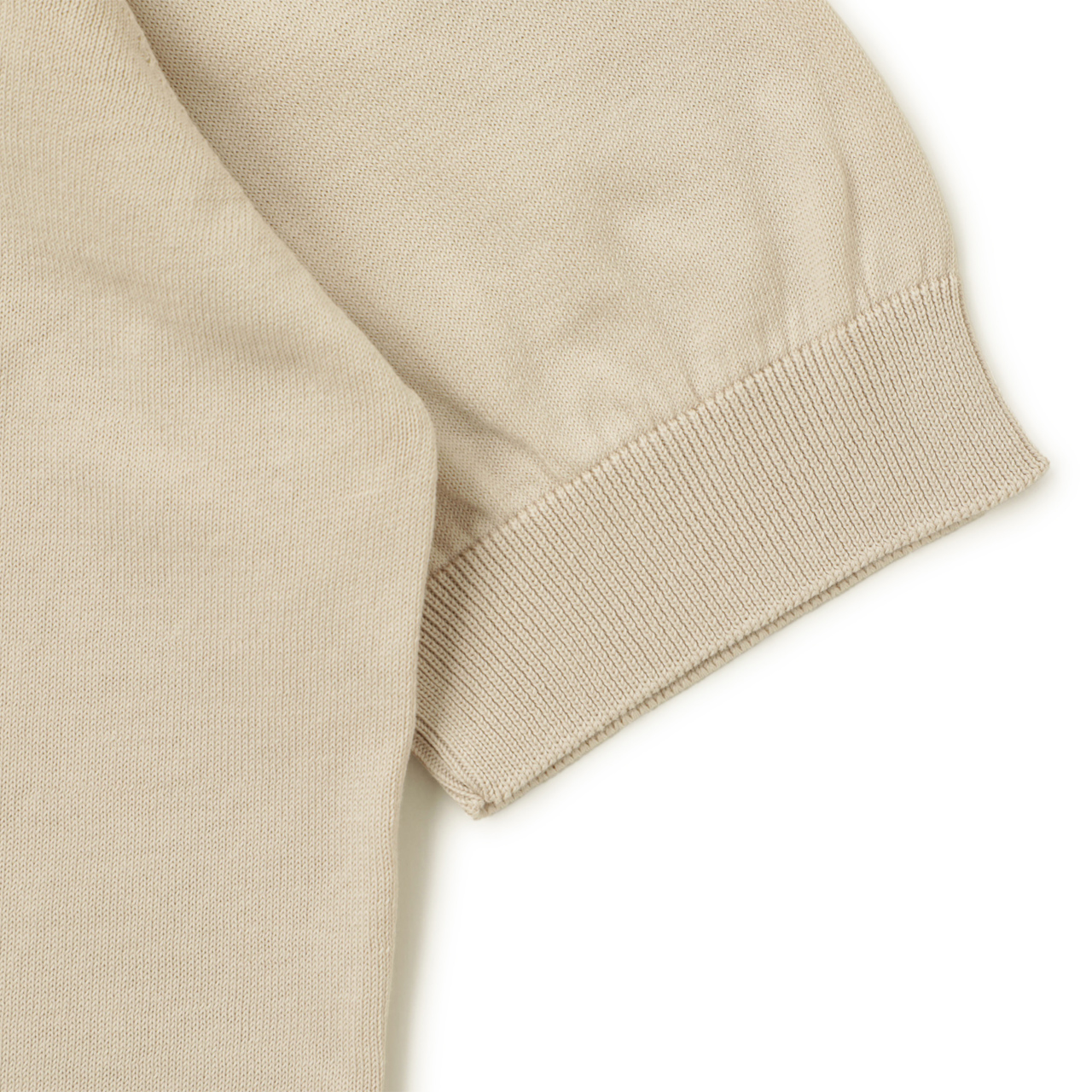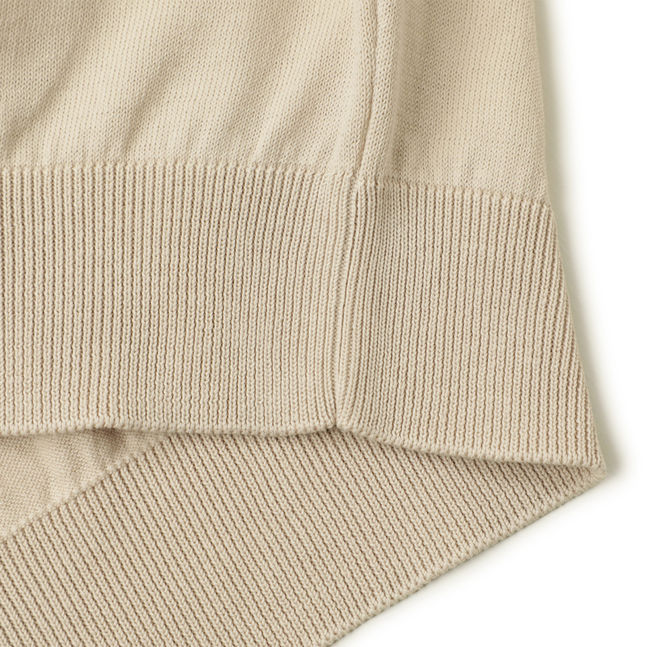 素材はコットン 100%。クレープコットンというドライでサラッとした風合いが特徴のコットンニットを使用しており、汗ばむ季節でもベタつきにくく快適な着心地を味わえます。