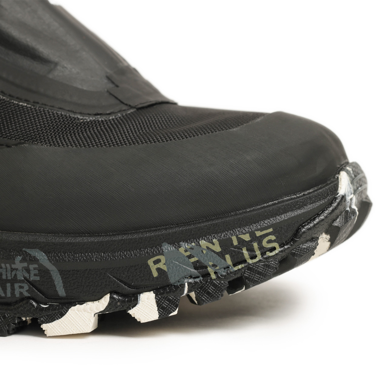 アッパーはナイロンをベースにトゥ、ヒールはTPUで切り替えを施しました。切り替えはソールに近い部分は圧着によって行われ、ジッパー部分も止水仕様にしておりますので防水性の高い仕様に仕上がった一足となっております。
