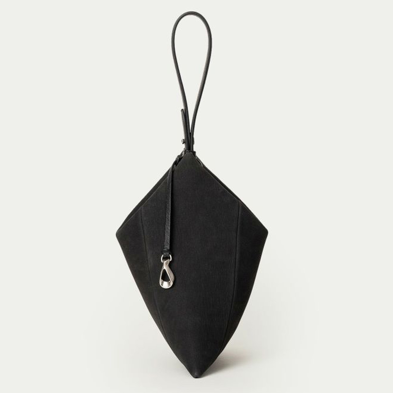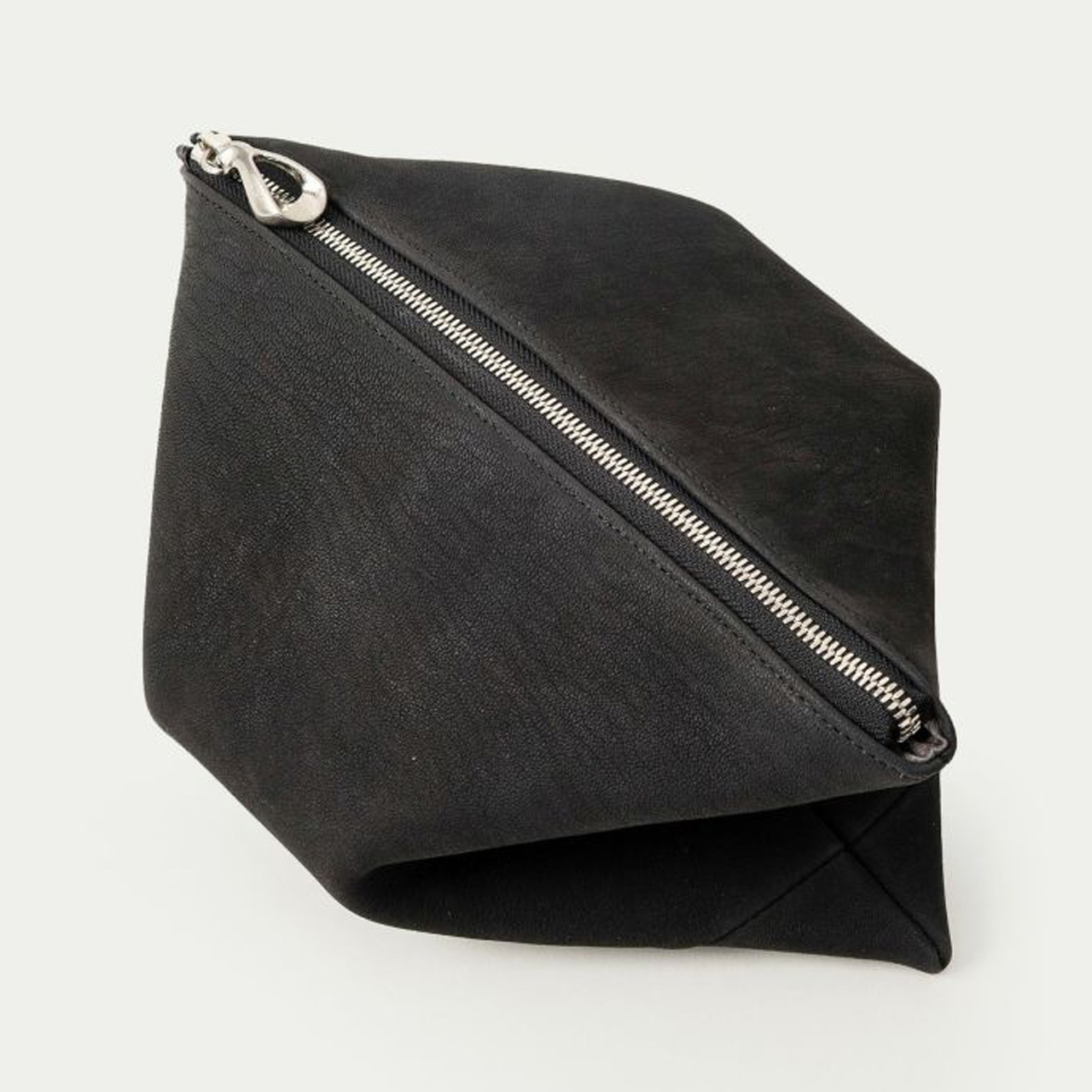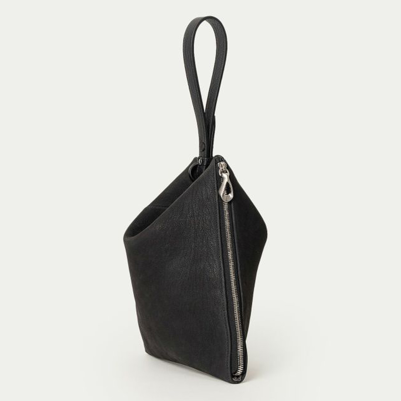 ハギ(繋ぎ目)は、前面センターに入れるのではなく、あえて両サイド斜めに設けることで、上部の三角形を生かした菱形のエレガントな印象へ。ゴートレザーのストラップは、接続金具を軸にフレキシブルに回転し、軽やかに手首に通して持ち歩くことができます。