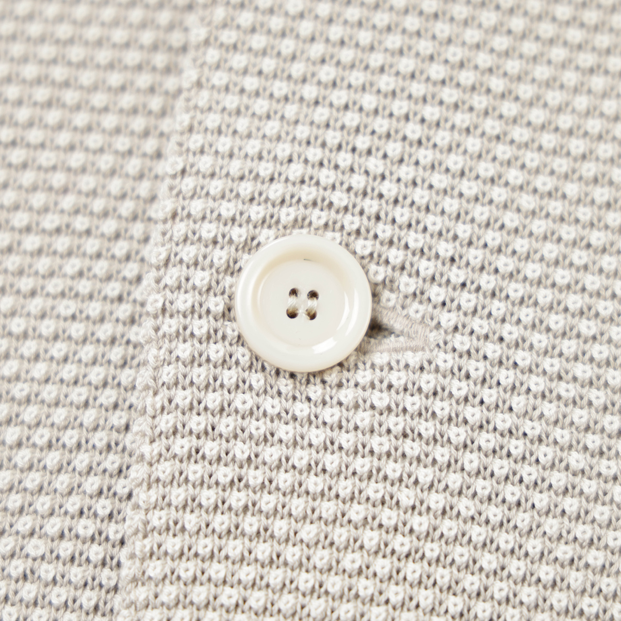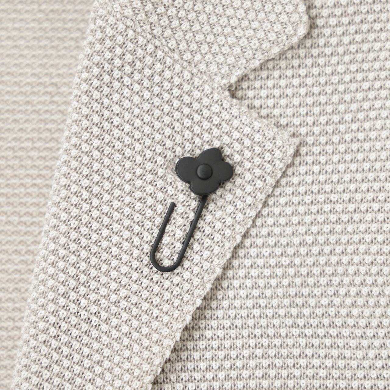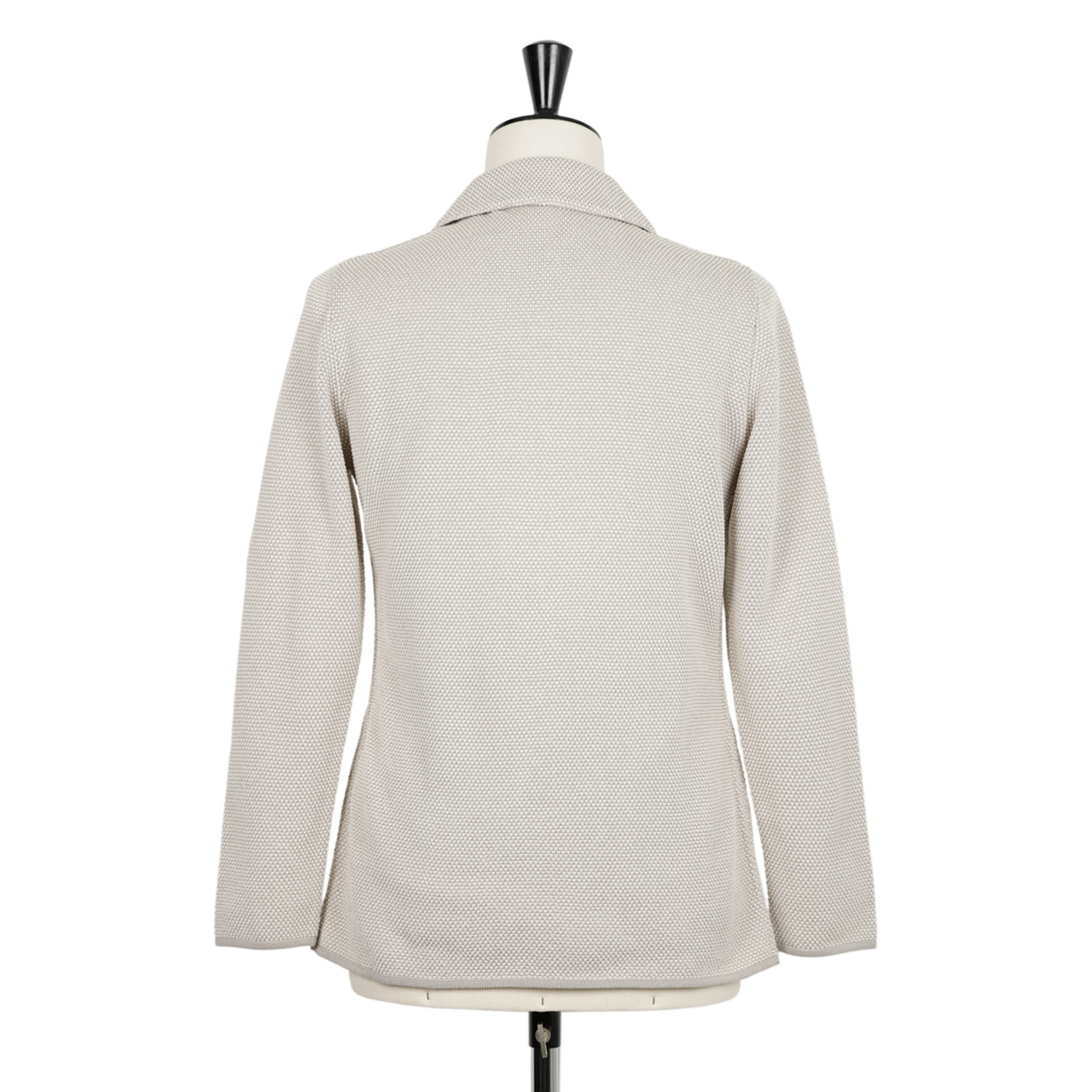 カラーはライトグレーをご用意。アイボリーとグレーの2色の糸を使ったニットでこの色合いを表現し、ユニークな編地で立体感のある表情を出しております。