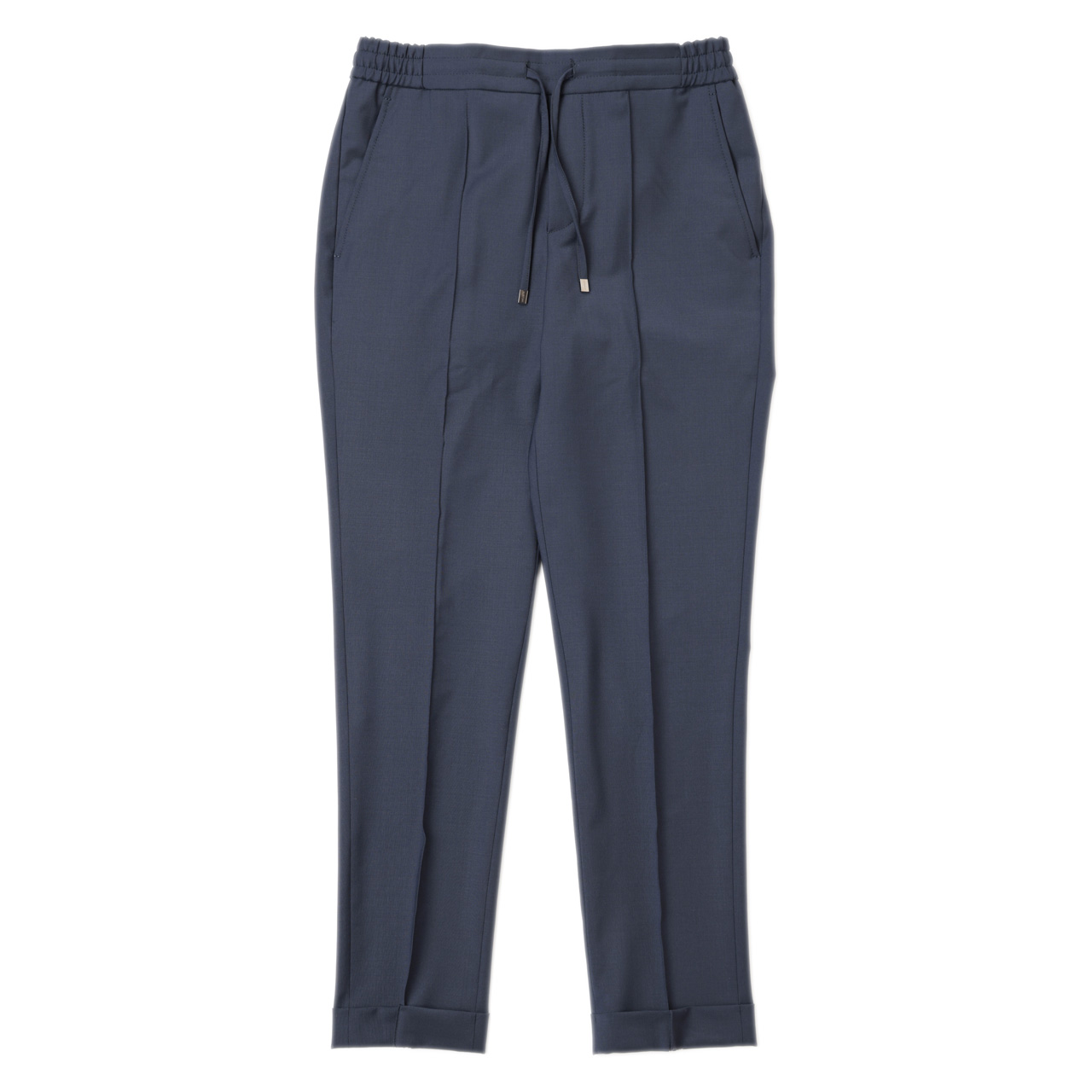 ウエストゴム+ドローコードのコンフォートな仕様にスラックスの様な裾のダブルの仕上げ、そして最大の特徴である「前後の永久クリース」。