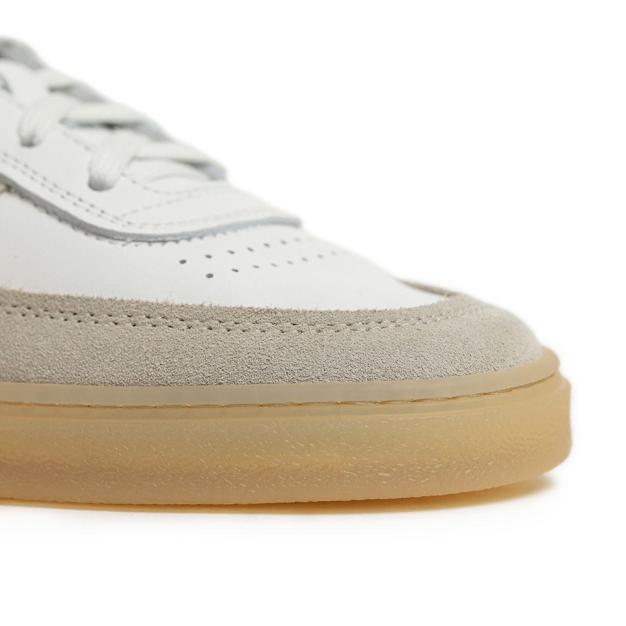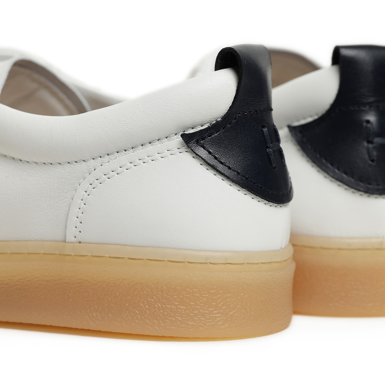 春夏らしいホワイトのカーフレザーアッパーをベースにトゥをグレースエード、ヒール部分をネイビーのレザーで切り替え。