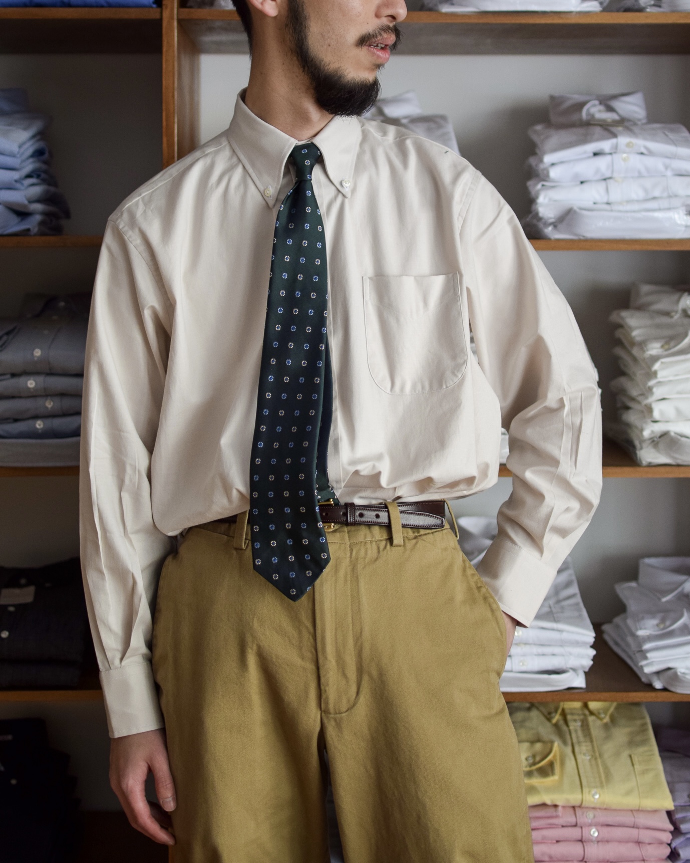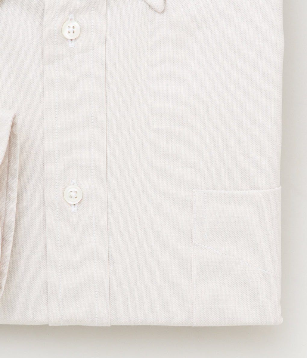シャンブレーなのでもちろんカジュアルではありながら、ベージュはドレスな雰囲気も兼ね備える上品な質感。40年代以前のヴィンテージシャツのような色と手触りで柔らかくしなやかな生地感が特徴。