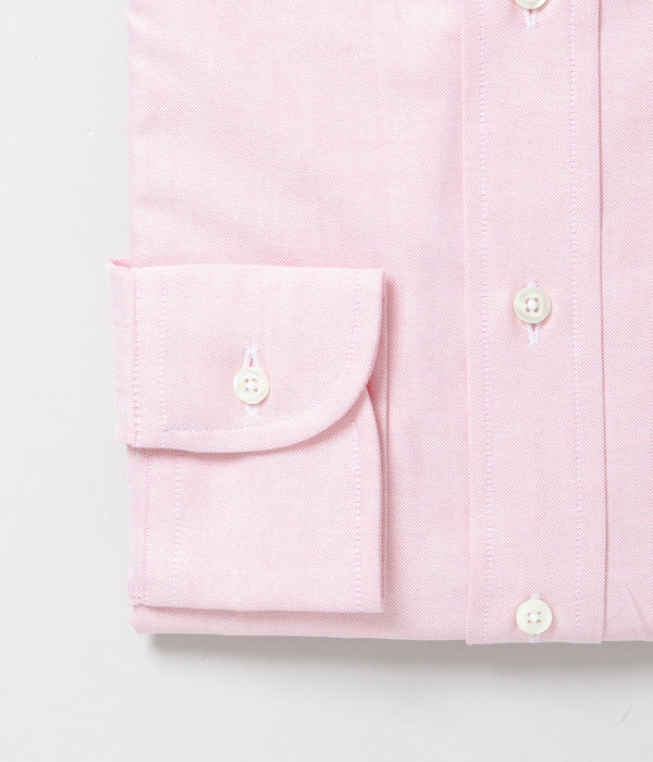 「オックスフォード」というのは縦横2本以上に糸を引き揃えて平織りされた組織の定義なので、素材や糸の太さ次第でさまざまな質感の生地が存在します。肉厚であり、且つ柔らかな手触りは経年で変化していく風合いを手にした瞬間から予感させます。古くから愛される大ぶりなロールのボタンダウンカラーがアメリカントラッドの歴史を語ります。
